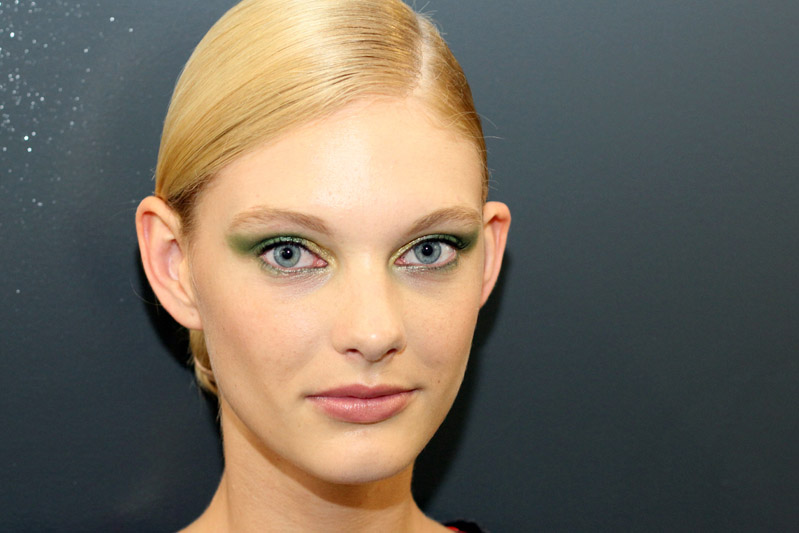 But the eye shadows first came onto the scene at Wu's Spring 2011 show, where makeup artist Diane Kendal swept them into the corners of models' eyes as a shimmery accent to the boldly hued lids she created for the likes of Patricia van der Vliet (at right, snapped post-show). “I'm all about color, and they're based on my clothing,” Wu says of the seven shades of silky Jewel Drop soufflé formula, which he also co-developed. “They're like the icing on the cake. These are dessert cosmetics,”