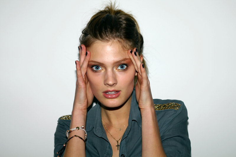 Constance Jablonski (Marilyn) wearing lip gloss from the Extravagant Pure Color Lip Palette, eye shadows from the Five Color Palette in Extravagant Gold, and nail lacquer in Extravagant Night, from Estée Lauder's Holiday collection. Photos and makeup by ITG.