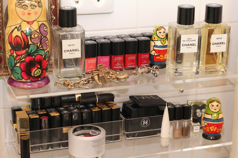 Anything that requires maintenance I don’t do—like I’d love to color my hair but realistically I’m not going every two months to get root touch ups; that’s not happening. So then I’ll do a bit of rouge, it’s this pink Chanel one. I used to use brownish rouge and Jeanine was like, ‘No, don’t use brown, it picks up discoloration in your skin,’ so I started using pink. I use a lot of Chanel makeup—I love the packaging, I love the color palette, it just works the best for me. But I also love MAC Ruby Woo, I’ve been wearing it forever. It doesn’t move—Ruby Woo will not leave your mouth. I can eat steak and mashed potatoes and it’s still there. And I just started using this Shu Uemura lip liner, just their red, and it’s amazing. For evening, NARS and Chanel have these cream eye shadows, Chanel’s are in a bottle, and I’ll use a bronze or a gold or silver and just smudge it on. I love them. I wear Chanel 'Beige' fragrance most of the time, but another thing I started doing is wearing Old Spice deodorant. Every man I've ever loved wears Old Spice...I love the smell of it.