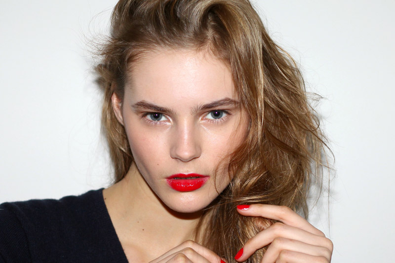 Juju Ivanyuk (New York Models) finally landed in New York this week. The nineteen-year-old beauty, a favorite of stylist Camilla Nickerson, opened and closed Céline, and was look #1 at McQueen. Juju is wearing All Fired Up nail enamel and Fire & Ice lipstick (with clear gloss), by Revlon. Photos and makeup by ITG.