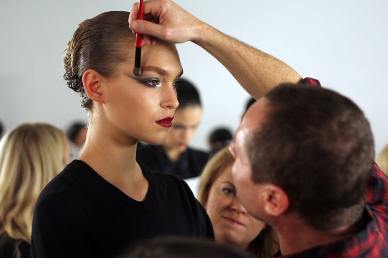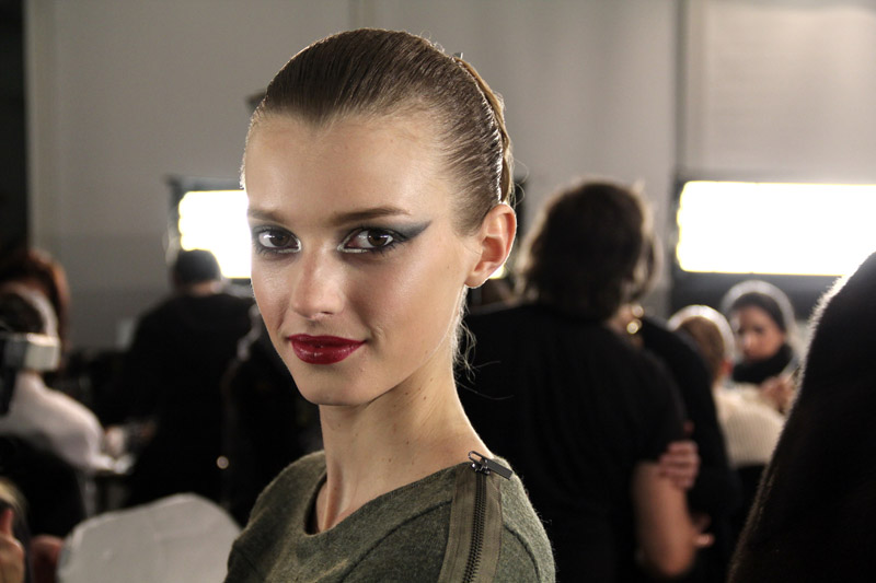 Tom Pecheux (MAC): The look this season is inspired by Johnny Depp and Kate Moss when they were together—you know, when she put on those chiffon dresses, and the big parkas? She's very chic and luxurious and a little 1920's. So for the makeup, I went with a mix of futuristic elements, like the silver 'tears' on the inside corners of the eye, and soft, kind of 'rock punk' shadow and liner. I like the girls to look powerful, but not like a dominatrix. I wanted that sensuality...I hate aggressivity. The lip color is a huge controversy—it's very ladylike, so bourgeois, but why not break the rules and add a classic lip to balance out the edgy eye? It's nice to see a grown up young woman.