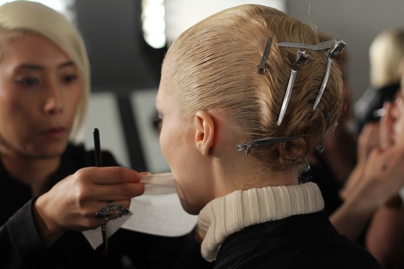 Paul Hanlon (Fekkai): This time Joseph felt that he wanted his girls to be a bit more mature. So we looked at pictures of women with very very done hair, but at the same time you have to be very careful because that kind of hair can look very old really quickly. This hair almost looks like a shell: it's clean off the face, tight, and really organic looking. I was inspired by that Julien d'Ys kind of world—very sculpted hair that uses product in a really excessive way. We're marcel waving it and using elastic to press into the hair so you almost don't know where it ends, and it becomes 3-D.