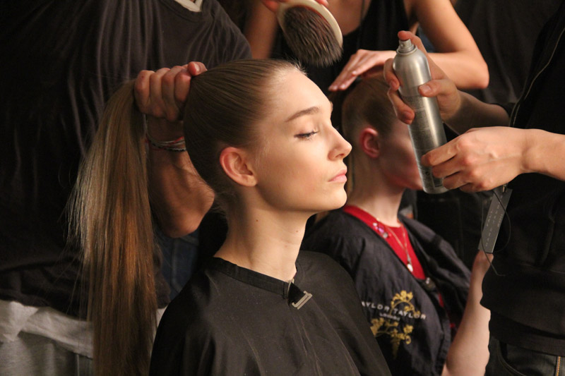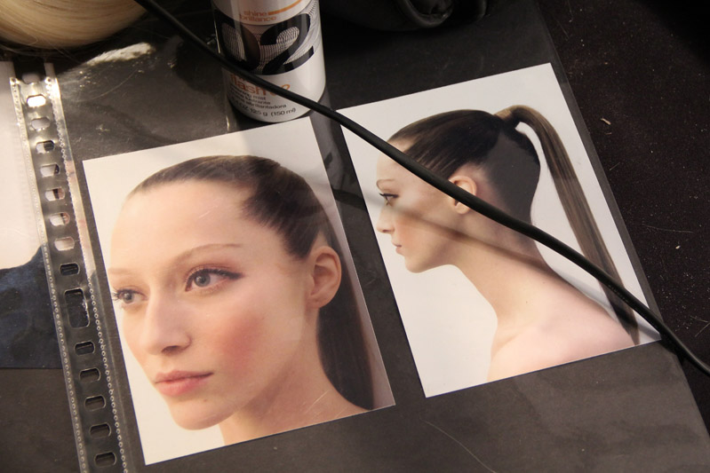 Guido (Redken): The hair has a kind of perverse, dominatrix perfection. It's pulled up, very high, very strict, using two products: Blown Away, which is a blow-dry gel, and Shine Flash. There are a lot of hats with chin straps so it had to be something simple but very perfect.