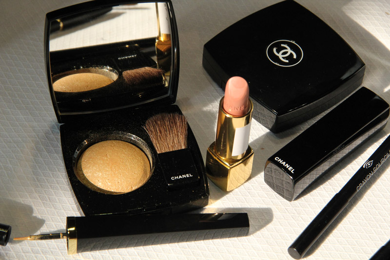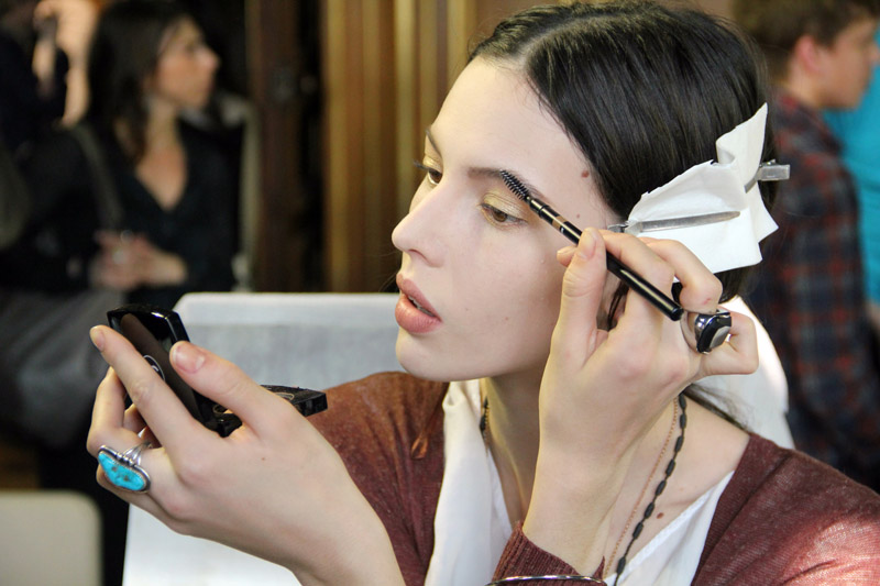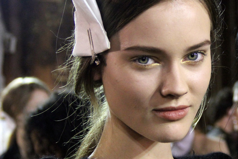 Peter Philips (Chanel): It’s a quiet moment in the face. It’s nude makeup with a touch of gold—there are a lot of gold elements in the collection: rings, bracelets, in the hair there’s the gold ring. So we did very natural, fresh makeup so as not to compete. On the eyes, we’re using a gold Chanel blush drawn on wet, with a gold liner that's new for fall 2011. And a velvet finish lip—not shiny, not matte—dabbing on Chanel Rouge Allure Velvet lipstick, in a natural shade. There’s no mascara, no blush, and the foundation is Chanel Pro Lumiere.