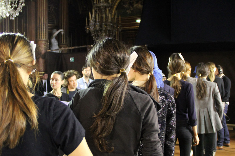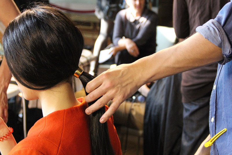 Paul Hanlon: Dries wanted it to be really simple this time, super easy. He liked the idea of all the girls having very clean hair with almost no product at all, like how they wear it to castings. And at the fittings, I saw all this really beautiful gold jewelry—I picked it up and thought, ‘We should use rings in the hair.’ So we made some, in two days! The hair texture is a bit messy, a bit dry, effortless—not to feel like it’s at the hands of a hairdresser. We’re washing the girls’ hair with Bumble and bumble Sunday shampoo, and then massaging their scalps with Styling Lotion for five minutes to get this fuzzy volume, without using a brush or a comb. This is my third season doing this show, and Dries said to me, ‘I want my women to look like real women, and not to look like they’re in a fantasy world of hair and makeup.’ People can relate to it.