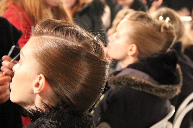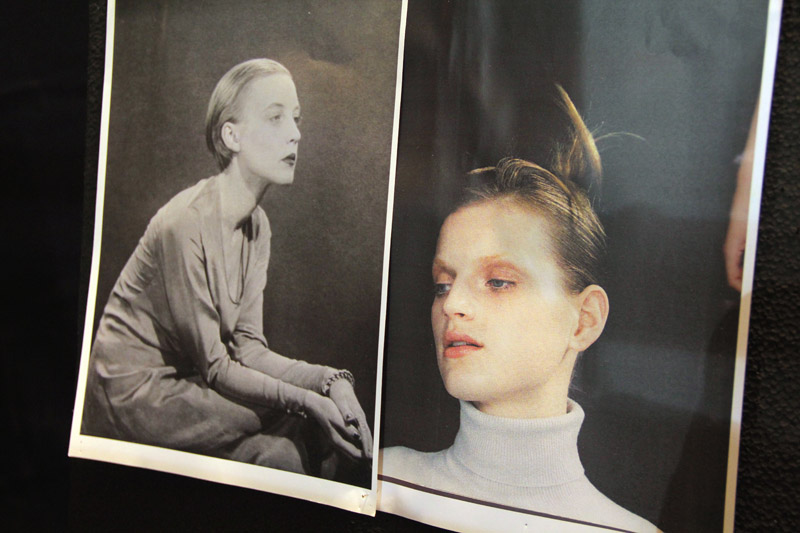 Eugene Souleiman: Well, I walked into the fitting and looked at the reference pictures for hair, and there was a picture from a Jil Sander campaign I did in the 90’s with Guinevere van Seenus—one of the first campaigns I’d ever done. Marco [Zanini] was talking to me about how he wanted to ‘redefine the word chic,’ and how he wanted to strip everything away to make something feel purer and more elegant. Normally now people think ‘chic’ means something expensive and really ostentatious, which he found really vulgar to look at. So we created an almost ‘handsome’ woman—a woman who’s so beautiful that she almost doesn’t need anything. We did a sort of manly side part and pulled the hair away from the face…it’s got a kind of GQ feeling to it, a little early 90’s. We’re combining a chignon with an injection of masculinity. Normally when you see hair up, it’s rounder and more feminine, lady-like. This is more square: there’s a regimentation to it but it’s not aggressive.