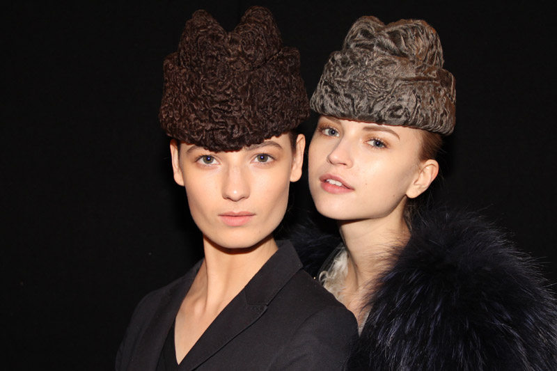 Lucia Pieroni: It’s very much about simplicity and a beautiful face—it’s very classic but it’s also slightly 90’s. There’s not much makeup: a little bit of shading on the eye, finished with gloss, a peach lip. It’s sort of about raw skin in a sense. I’m giving them a mini-facial before I start, with Shiseido Benefiance fluid—it gives a wonderful glow to your skin. And then I’m using Clé de Peau Defining Fluid Foundation—it’s super light and luminous. The eye is all about light and shade: I’m starting with a taupe-y cream eye shadow and finishing it with MAC lipgloss. Eyebrows are boyish and quite straight—I like using powder to fill them in; MAC eye shadows are the best for that.