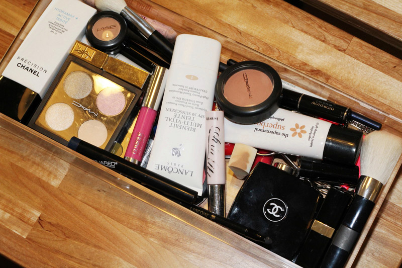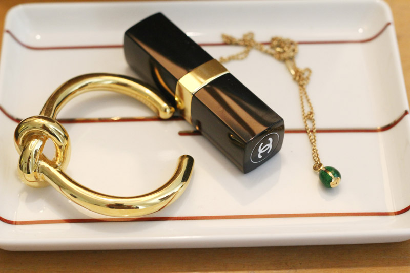 I love to switch my bags but I always lose makeup in the bottom, so I got this tray and every day I ‘drop off’ whatever’s in my bag, in here. Like when you put your keys in the same spot when you get home—that’s what I do with whatever products I have in rotation. And I have this little vanity inside my closet with my perfumes and some jewelry. I’m very fortunate that my husband loves the perfume that I love: Coco Mademoiselle, in every form. I was coming home from Paris fashion week one time, and discovered at Duty Free that they made Coco hair perfume. It’s a little more powdery than the regular perfume. I also just love that there’s such a thing as ‘hair perfume’!