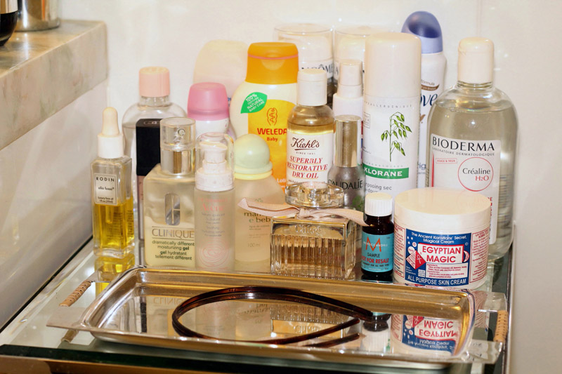 I had really bad skin at the very beginning of my career, when I was fifteen, and that really bothered me. When you’re a girl, and especially because I’m a model, it sucks, you know? I was so self-conscious; I’d look in the mirror and cry. It was really painful. I took Accutane for a while and that helped. It’s a strong thing but it really changed my life. The only thing is, my skin became dry after taking that—it kind of dried everything in my body—so I make sure to moisturize very well. I like the Clinique Dramatically Different Moisturizing Lotion, and I love Rodin Olio Lusso. I put it on after a very hot shower and it soaks in. Oh—and Egyptian Magic. It really has the right name because it is truly magic. It cures everything from sunburns to chapped lips, anything. When you have really beautiful skin, that’s all that matters, so I protect it from the sun, clean it very well. I really care about removing the makeup. I use Lancôme and [Bioderma] Crealine, which I get in Paris every time I go. I carry around two things: Laura Mercier concealer, which I really like, and this tinted MAC lip balm which I also use on my cheeks. I wear mascara when I go out—I like CoverGirl LashBlast Length. At this point I pretty much know what works for me. For example I know I need to extend my eyebrows a little bit with a pencil, because they’re a little short, so makeup artists will fill that out. And people know not to put much foundation on my face because I have freckles. I hated my freckles when I was little—my best friend and I did everything we could to get rid of them! We got teased so much. Now of course I like them.