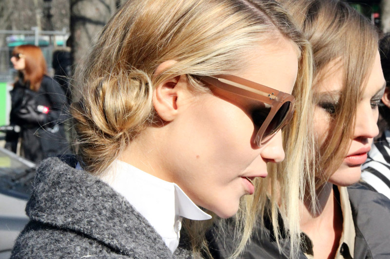 The messy side bun (shown here on buddies Sasha and Natasha) that hairstylist Sam McNight created for Chanel’s Fall/Winter 2011 show screamed “Try me!”, but wrestling with a few (okay, maybe quite a few) bobby pins leaves me shaking in my boots. Remember Julia von Boehm’s—well, her “Julia von Boehm”-do? Yeah, still haven’t figured that out. You just can’t see back there. But right around the time I was editing my Paris Fashion Week pictures, I discovered something wonderful. Goody, the veteran mass-market purveyor of hair accoutrements, had the good sense to take wine-opener-corkscrew technology (my guess) and pour it into two little molds, thereby creating Spin Pins. If this were a toy, the box would say “safe for ages 5 and up”. It’s that easy. Gather your hair into a rope, maneuver it into some sort of bun, and simply twist in the pins one at a time, close to the scalp, from different directions. Like anything beauty-related, it could take a couple of tries until you get the hang of it. And, only two pins will hold up all of my fine/thick/curly hair, you ask? Yes, yes they will. For under seven bucks, choose your color (“blonde” or “brunette”), see for yourself, and thank me later.
