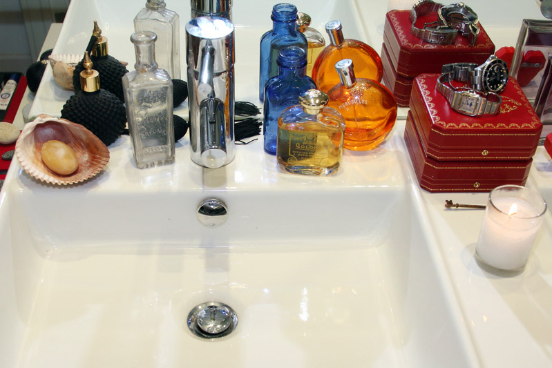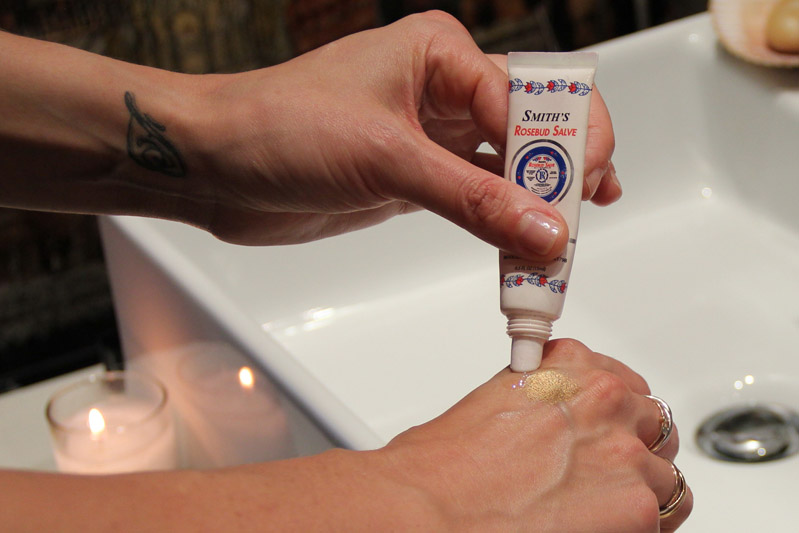 For me, for myself, when I wear makeup, there’s always a lip. I always go to the same two colors— Schiap [pink] and Heat Wave [orangey red], and since Christmas I’ve been using the ‘ Bento Box,’ which is a limited edition set of hand-poured lipstick in kabuki cups—it’s a beautiful red and a hot pink. I edit the makeup that goes in my bathroom from two huge suitcases and four drawers in my office that are always filled with makeup. If I continue to bring stuff upstairs, my husband’s like, ‘Oh my God, you have seven hundred eye shadows up here,’ and I’m like, ‘I know, I know—I can’t help it.’ I love playing with eye shadow, and I have so many different tricks—like, Smith’s Rosebud Salve is amazing for mixing with eye shadow to create a cream color. I usually do Étrusque, a shimmery gold. It creates a nice balm for the eyelid, a little dewy. I do this for editorial [shoots] too, but for real life, I don’t make it too gooey and I always set it on the lid by pressing a little of the dry shadow on top. Or, I’ll wet an angled brush with water and use a bright blue eye shadow like Night Flight as a liquid liner. I love bright pops of color. For makeup, I always use my hands. I don’t have that many brushes. Even my lipsticks look really deformed because I use my fingers. I like warming up the product—I use the back of my hands as palette, like with the Rosebud Salve, it gets emollient from the heat. And I feel like with foundation, I can get into the nooks and crannies so it becomes seamless, whereas a brush leaves marks and the product kind of sits on top of the skin. And a sponge soaks up too much product. My recommendation is, if you want to use a sponge, use a dry one to kind of blend the face after you’ve applied foundation with your fingers.