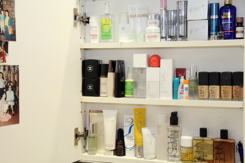When it comes to skin care, I love creams—heavy, dense creams. I’ve stuck to Crème de la Mer for years—the classic moisturizing cream and the Eye Balm Intense. My mom got me hooked on it, and she also got me hooked on something called The Green Cream, which has a really high dose of Retinol. That’s for times when I know I’m going to be off for a couple days, because it exfoliates your skin to a high-speed process and your face gets bright red. It’s kind of like a mini peel in a bottle. But I also wear the EFA Night Infusion and the Brightening Serum from NARS, and Shiseido just sent me their new cream— Future Solution—which I’ve been using, as well as their SPF for face. I love Bioderma Crealine, which is every makeup artist’s staple, for the kit and for at home. I love it because it takes your makeup off and tones everything. And for a proper cleanser I like Clé de Peau. For body, I’ll use NARS Monoi Body Glow oil which gives the body a nice sheen…sometimes I’ll add a few drops of that Laguna Body Illuminator to it, especially to my legs if I’m going out. I always want a sheen for my body, a baby oil or Kiehl’s Crème de Corps, and I also find that keeping the body moisturized holds the self-tan for longer. My face is oily though, and for that reason I believe less if more. A lot of the skincare brands give you those little spatulas, and that’s meant to show you how much product you should use—a quarter size of moisturizer is a lot; you really want to use a nickel size. I also love our Skin Smoothing Face Prep—you can use it as a primer, before makeup, but it’s also great for mattifying oily skin throughout the day, even on top of makeup. I use this product like nobody’s business; it’s my Jack of all trades.