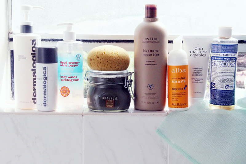 I’ve got a bunch of stuff in my shower—I got this scrubby cloth from Japan; they use it in all the bathhouses there—all the older Japanese women were doing it so I decided to copy them. You know how a lot of loofahs, as soon as they get wet, they get soft, and it doesn’t do the exfoliating you expected it to do when it’s dry? This is really rough which is good. I use Borghese mud on my face sometimes—you feel it tingling on your skin. And I love Dr. Bronner’s soap; you can use it for anything…like, even laundry detergent, if you run out!