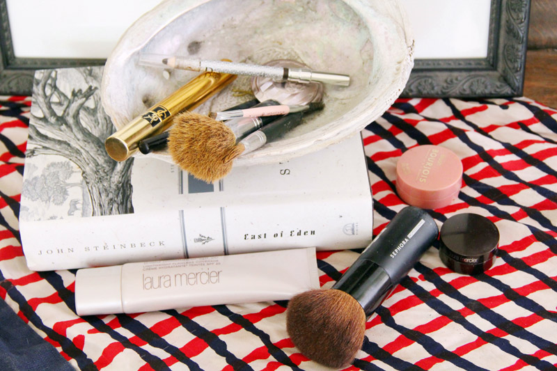 For makeup I use Bare Escentuals original Bare Minerals foundation, with the brush. And I have this Dior eyeliner that I love, and black YSL Volume Effet Faux Cils mascara. Sometimes I’ll fill in my brows with Anastasia Beverly Hills powder. I pluck my own eyebrows; they’re so thick that if one hair goes astray, it’ll leave a huge gap, so it’s good to fill them in a little. I use Desert Essence Jojoba Oil as eye makeup remover—it’s really cheap, and it works better than any eye makeup remover I’ve ever used, and it’s totally natural. It’s like, four bucks for this little size. And that’s pretty much it for makeup.