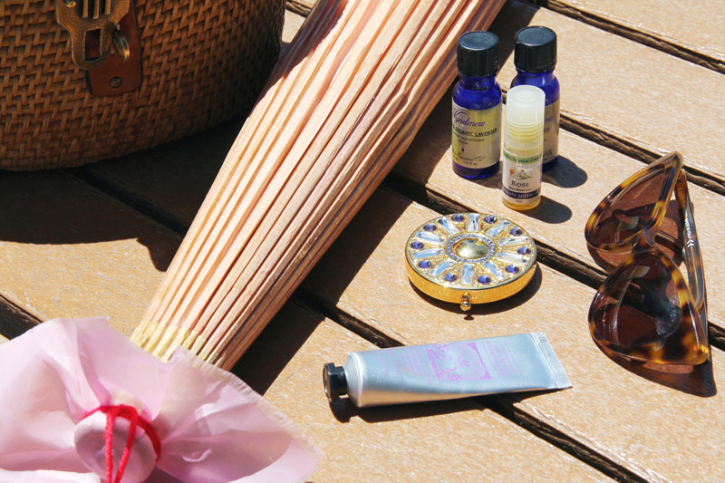 I always wear a lip, even in the morning to yoga class or ballet. Right now I’m wearing Girl About Town by MAC—but I like reds, I like Dior Celebrity Red, I love Guerlain reds and the Guerlain packaging. I like heavy beauty stuff—I always carry a nice compact, like this limited edition Estée Lauder one. But I also buy them vintage…you can buy vintage lipstick cases on eBay, and stick your MAC lipstick into the vintage container. If you put it in the fridge first it will come out easier. I also always carry my oils—right now I have sandalwood, lavender, and rose. I use them for aromatherapy and perfume. I mix all different oils—my bathroom at home is littered with oils; I’m really into natural beauty and natural healing. Peppermint is really good if you put it on your stomach for a tummy ache; lavender is kind of all-purpose—I think everyone should carry it. It’s good for everything from bug bites to anxiety to headaches to nausea to insomnia, anything. Like if I’m going to an event or something and I get a little nervous before I arrive, I just sniff the lavender. I like the Simpler brand for oils, which you can get at Whole Foods. I get a lot of beauty products at Whole Foods.