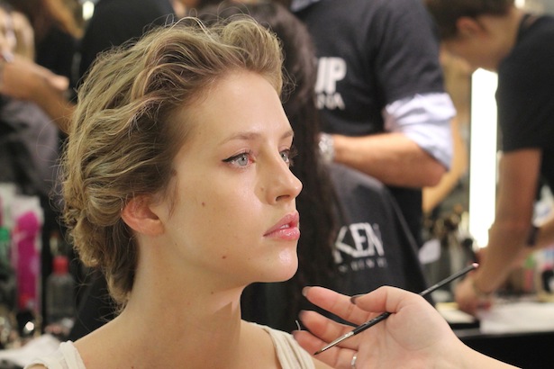 Pat McGrath (Dolce & Gabbana): She’s a beautiful, fresh young Italian girl—it’s this cinematic, modern beauty based on Sophia Loren. Just a teeny little eyeliner done with black pencil, pulled out, and we’re adding a quarter length of false lashes to the outer corners. Then we’re doing brown Coffee pencil underneath just so it’s not really hard…with tons of Secret Lash mascara on the top lashes. We’re using the Creamy Foundation on the skin and then a mix of Provocateur and Rose blush mixed together which gives a really healthy glow, and we’re doing a beautiful sheer nude lip with Imperial Passion Duo lipstick. The brows are super groomed because we are giving a nod to Sophia, and it was all about the brow with Sophia Loren.