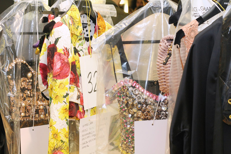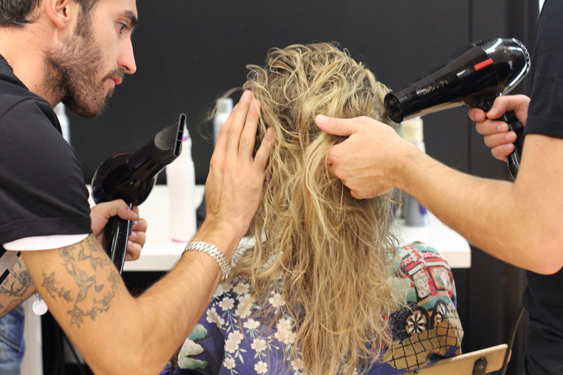 Guido (Redken): She’s in a market in Sicily on a hot summer night, so the hair is very soft, very pretty. I’m putting Redken Thickening Lotion in the hair to prep it, and then around the perimeter we’re lifting the root with a curling iron and finally sweeping it up very very softly—so everything looks like it could just fall out—soft around the neck, soft around the ears…it’s about a beautiful woman, really. That beautiful Dolce woman.