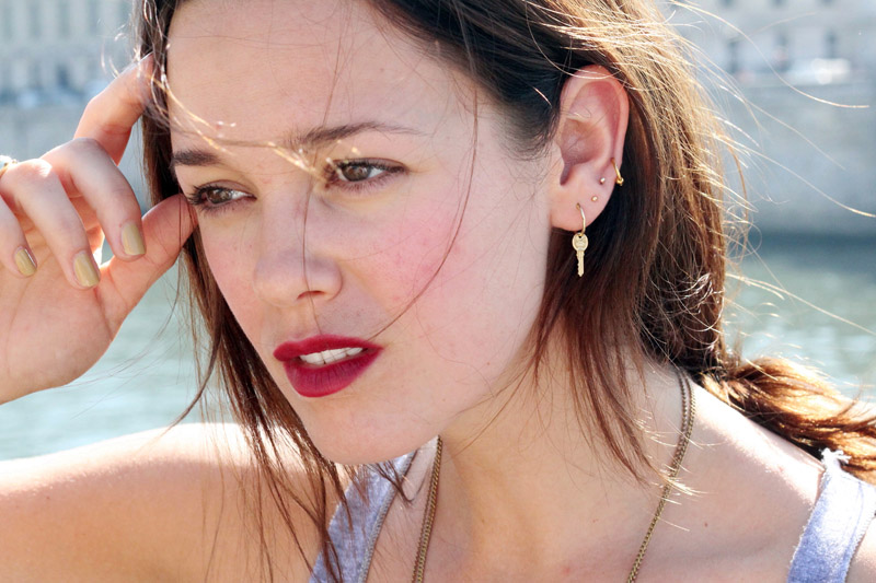 Meet Sid. I first spotted Sid backstage at Proenza Schouler last season. She was applying makeup to fellow Dutchwoman (Siddhartha? “My father was a hippie”) Bette Franke, at the station beside her mentor, lead artist Diane Kendal. If ever there was a girl who made a case for matching lips and nails, I thought, this is she. Both were a rich, perfectly executed blood red. Then there was the hair: hers was remarkably similar to the mussed tangle-braid being created on each of the models going down the runway. Happy coincidence or…inspiration? Who is this girl? In the pre-show scramble, all I managed to do was hand her my card and try to explain in an un-stalker-ish way that I had to shoot her for ITG. Fast-forward eight months, another Proenza encounter, and many emails later and there she was on the Pont Alexander III bridge in Paris, showing me that mustard/khaki nail polish (American Apparel “Trenchcoat”) is possibly the coolest color around.