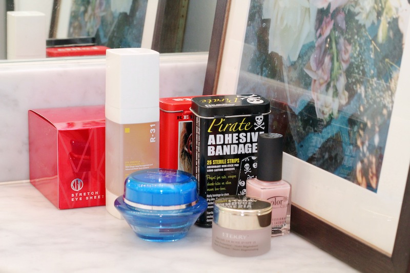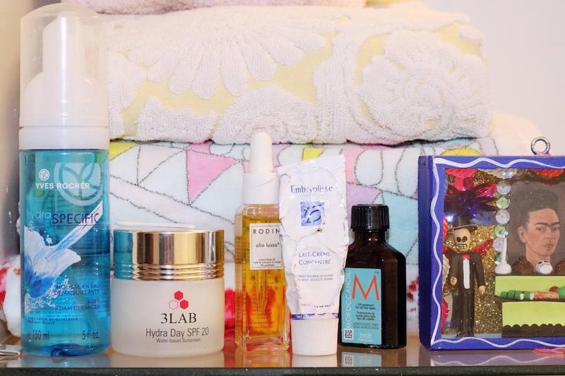 For skincare, I wash my face with Yves Rocher foaming cleanser, or Cetaphil. I use Clé de Peau eye treatment for under my eyes, and I use this before I go to bed, for your lashes: MD Lash. Another good eye thing is Euoko R-31 Eye contour brightening gel; it goes under concealer to stop it from getting flakey. The guy at Barneys told me about it. [Laughs] Especially in the winter, I love moisturizer, and Embryolisse is great. I’ve been using Rodin oil for a while, and 3Lab Hydra Day SPF 20. It’s kind of light so you don’t feel like it’s clogging your pores. I just went to Barneys with my sister and said I needed some kind of moisturizer with sunblock—I asked across the board, which was the best, and they said this was the one. This is another good thing I use, Lancer Repair AM PM Nourishment—he is an amazing dermatologist in LA—my friends go to him, but I just get the products. And By Terry Baume de Rose I feel like is the new Elizabeth Arden Eight Hour Cream.