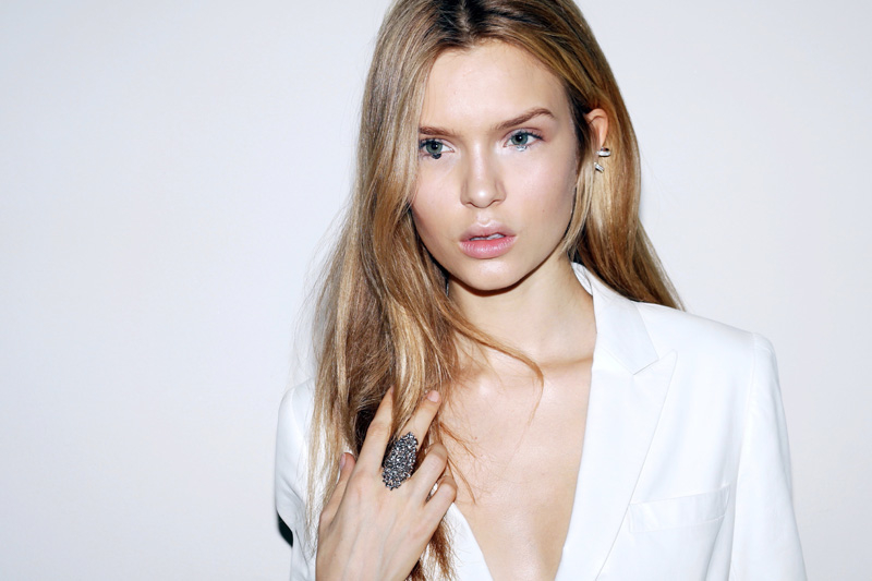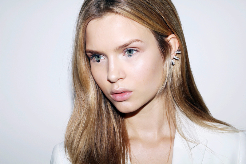 So, Josephine popped by the other day for a little bit of runway-to-reality fun. We followed Pat’s lead and kept the face fresh, focusing on glowing skin: cleansed and well-moisturized, spot-correcting with concealer as needed. I used CoverGirl’s Intense ShadowBlast in Beige Blaze as a highlighter, dabbing it across the cheekbones, under the eyebrows, on the inner corners of the eyes, down the bridge of the nose and on the Cupid’s Bow. Now for the sequins. I applied them with false eyelash glue from Duane Reade, a tweezer, and a very steady hand. The upper and lower eyelids should be dry—use a clean eye shadow brush to lightly dust the area with translucent powder first. Dot the back of the crescents with the tiniest amount of glue and place them just above (and below) the pupil, right against the lash line. The two halves should mirror each other when your eyes are closed. (This took several attempts...if you need to try again, just peel the sequin off and use makeup remover and a cotton swap to remove the glue before starting over.) Add a dab of Eight Hour Cream on the lips, a white leather le smoking by Reed Krakoff, and jewels from Repossi, and voilà: the coolest party look around.