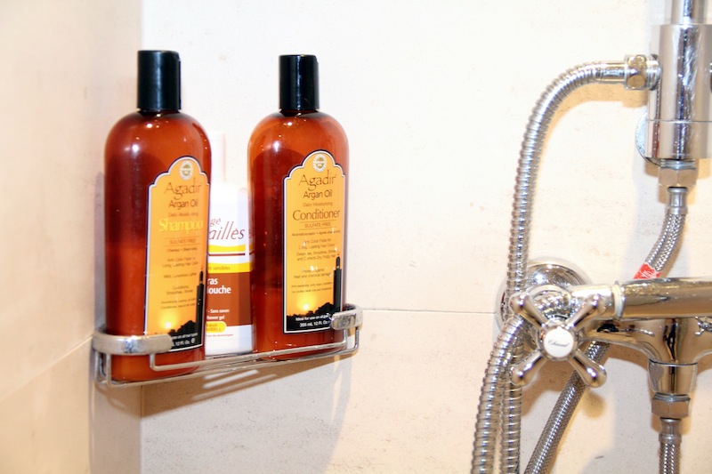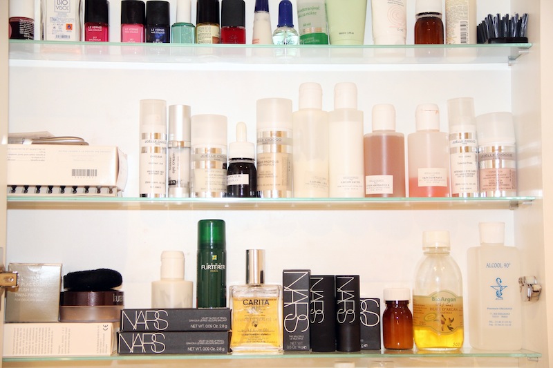 I go to Christoph Robin to get highlights. Over the summer I did this stuff, the keratin treatment…I think it’s super when you first get it, and at the end it’s kind of a mess. The Carita Fluide de Beauté is for my hair. This could be for your face, for your body, but I use it for my hair, and when I don’t have time to wash. And I’m using René Furterer Dry Shampoo—this is one of the French tricks, the dry shampoo. Here, when you don’t have time to wash, and you want to add one extra day, we all do that. I prefer this one to the Klorane one. And this is amazing, that you can’t find anywhere instead of New York: Agadir Argan Oil Moisturizing Conditioner. This is the best. John Frieda in the meatpacking district, he sells those, but you can’t even know because you have to ask him if they have Agadir, and they say no at first, and then you have to insist. You know what is so amazing about it? It’s sulfate-free, because me, I have naturally very curly hair, and this makes it more relaxed, and smells good. When I’m running out of those products—I’m never running out, I’m freaking out, and I buy another one.”