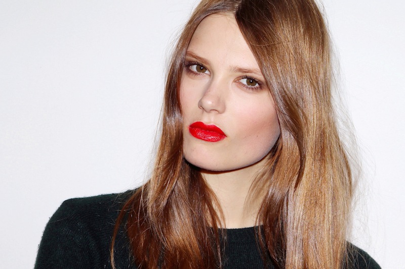 Candy apple red, ultra-moist lipstick—straight from the tube, two coats, one blot in between. Lancôme L’Absolu Rouge in L’Absolu Rouge.