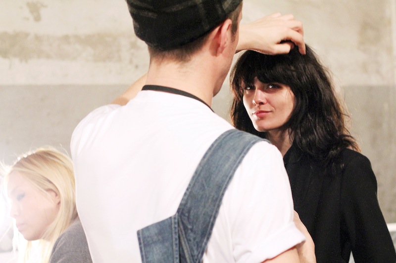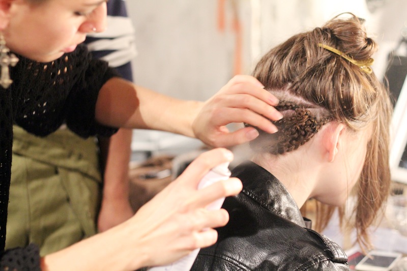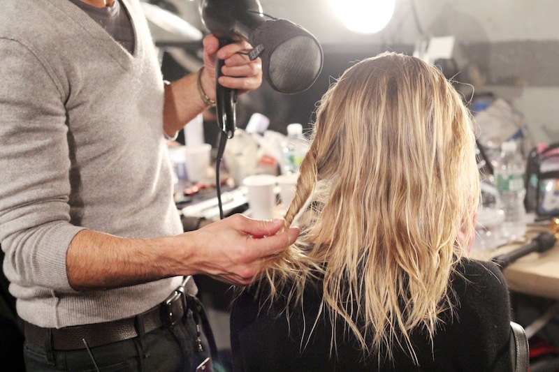 Paul Hanlon (Fekkai): For me, today, it’s really about each girl’s individual beauty. It’s not about a ‘look’ today. It’s all about purity. When I spoke to Jack and Lazaro, they felt like all week, all the girls have their hair and makeup done, and it’s almost like we just wanted to wash it all away. The casting's amazing—they’ve got these brand new girls—and we’ve colored a lot of their hair quite dark, at the Fekkai salon. The first ten looks of the show are all white, quite Japanese inspired, and the boys liked the idea of these really white clothes with really dark hair. The clothes are quite inspired by Martial Arts—and when you think of Japan, you think of this kind of perfection, this kind of laundered feeling. So with the girls, we’re stripping it all back to the basics. We’re literally washing every girl’s hair with the Apple Cider Clarifying Shampoo, in that mini bathroom over there [laughs], and then, even though I’m saying it’s pure, I am putting a little bit of product in because as you know, if you leave your hair to dry naturally it goes a bit flyaway and out of control. So we are using a little bit of Fekkai Anti-Frizz Silkening cream, and this really acts as a leave-in conditioner, just to weigh the hair down. Not a lot—like the size of a quarter, from mid-lengths to ends, combing it through, so it gets distributed through the hair really nice. And then just letting the girls’ hair naturally fall, in their natural part—so some are on the side, some are in the middle—as it is. Tucking it behind the hairs, so you get that beautiful little mark, like Bardot used to do a lot, and then at the nape, twisting it all together and applying a bit of the Tousled Wave Spray, again just at the mid-lengths and ends, so that when it dries, it dries quite languid and skinny. So I suppose in a way, people think that hair has to be full and beautiful, but it’s almost the opposite today. When they put on their jackets and their hair gets kind of tucked in or caught, it really feels like a moment—like they’ve just walked in off the street in these amazing clothes. She’s not wearing any makeup and she hasn’t got her hair done, and it really is about raw, natural beauty. And for the girls who have a lot of hair, without many layers, sometimes we’re braiding up a third of the hair underneath, to thin it out and make it more like a cool girl…a Kate Moss vibe, a little bit Patti Smith also, with that dark hair and the bangs and all that.
