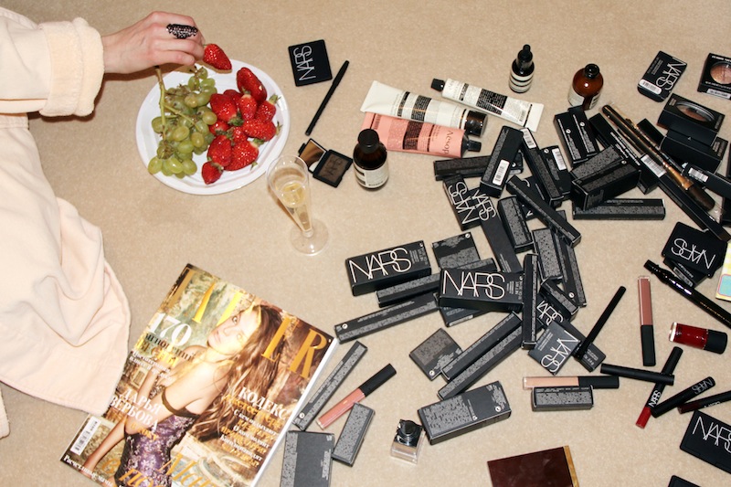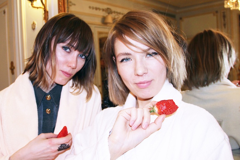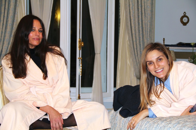 Last week in Paris, in the middle of shows, backstage appointments, shoots, dinners, and shopping, a group of very busy girls skipped into room 461 at the Ritz for the best kind of party (in my mind): one that involves changing into a fluffy pink robe at the door, singing along to Whitney Houston and Mariah Carey, flipping through magazines, and playing with makeup. Anya Ziourova— Russian Tatler’s Fashion Director—greeted Gaia Repossi, Natalie Joos, Lisa Marie Fernandez, Vika Gazinskaya and Stephanie LaCava with flutes of champagne and slippers before settling into the middle of the room to sort through a huge pile of goodies that NARS, MAC and Aesop sent over for the evening. The bubbly spilled all over the carpet, but no matter—after all, the famed hotel is closing for two and a half years of renovations. We were set on bidding it adieu in style.