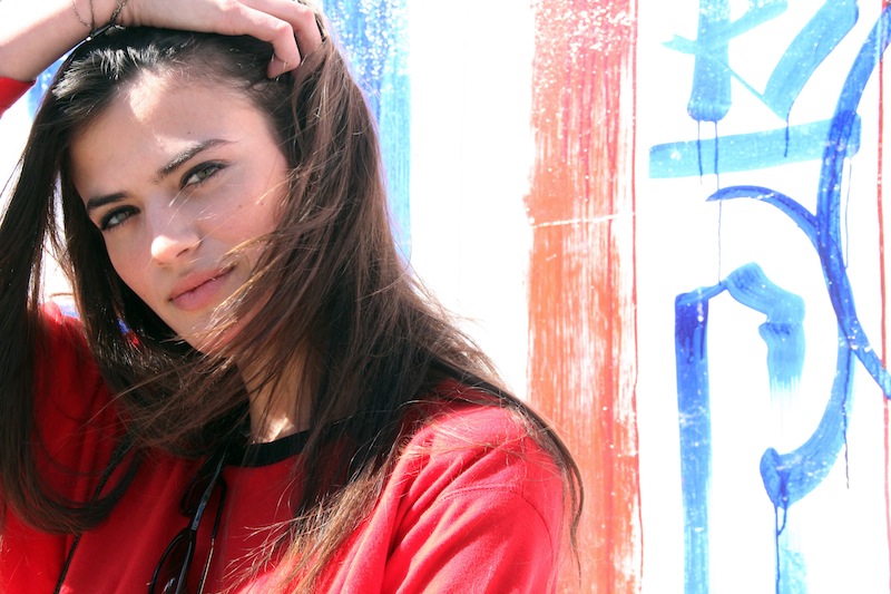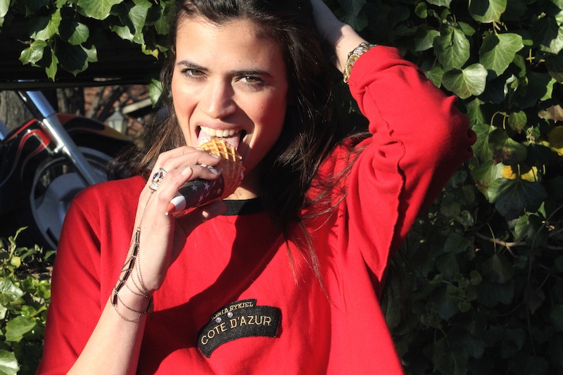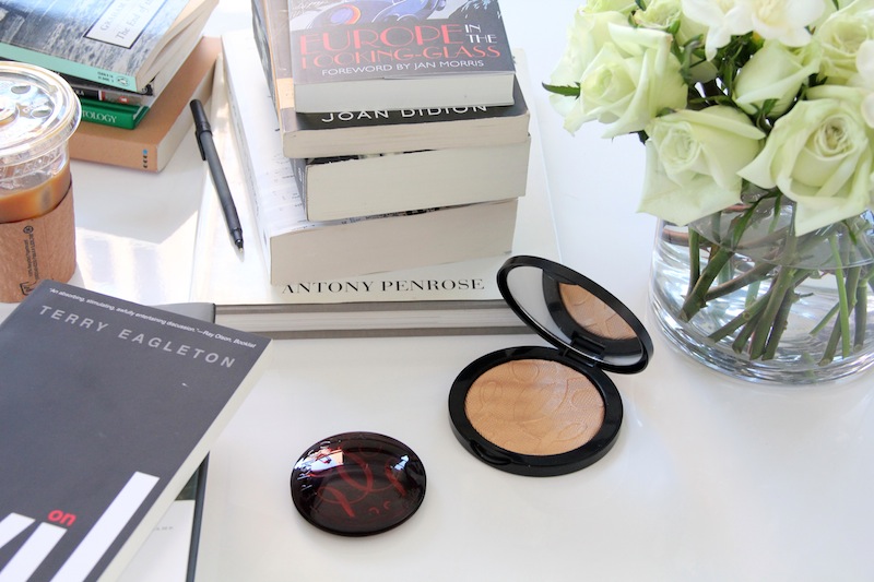 At her place on the Bowery, there were six pairs of short shorts and hot pants laid out on the bed— six—which seems like an appropriate number for someone who, at just over 5’10, can wear that sort of thing with flats and still look good. She threw on her mom’s Sonia Rykiel “Cote D’Azur” sweatshirt from the ‘80’s, slipped into Proenza flats and sidled up to the kitchen table to check out the makeup. The Sun Brunettes 05 has a touch more coral to it than my tried-and-true Brunettes 03—it’s a little warmer and works really well with a preexisting glow…which Alessandra has pretty much year-round. I swept it where the sun would hit, and dusted the sheer, shimmery Golden Glimmer Palette across the tops of her cheekbones, down the bridge of her nose and pressed it onto her eyelids with my finger. Wanting a bit of a dewy sheen, I grabbed a tube of Homeoplasmine (aka the French Aquaphor) from my purse and dabbed it on top so the look felt more lived-in.