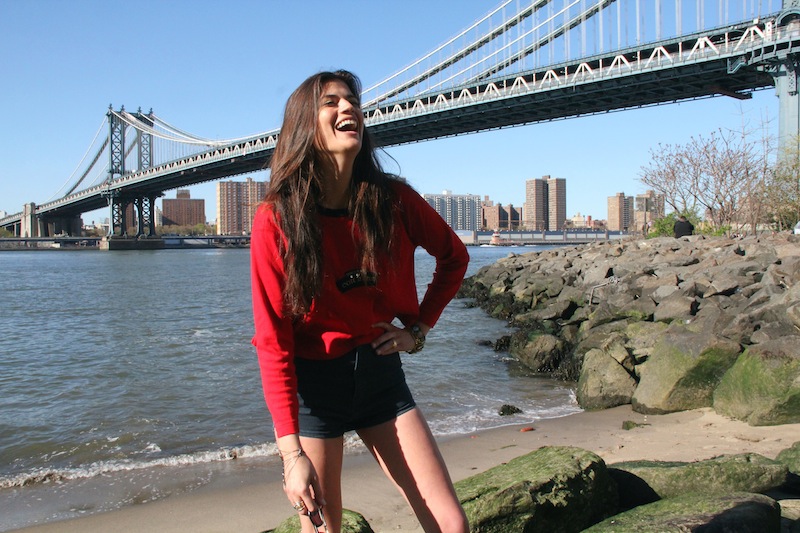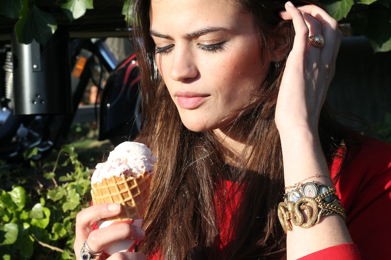Now—all dressed up and where to go? When the weather is this nice, it doesn’t take a lot to make me happy—sitting at a café table outside and having margaritas with friends will pretty much do the trick. But since that makes for a rather boring adventure, we opted for a trip across the river. The Brooklyn Bridge Park is now at the top of my list for lazy Saturdays spent outside—that, and the far Rockaways, or the “anti-Hamptons” as the New York Times dubbed it last year. Alessandra and I were going to make the trek out there until we realized it’d be at least an hour on the train, and I wasn’t sure of the food situation at the other end, so, to Brooklyn we went. The Dumbo waterfront has a refurbished 1920’s carousel offering $2 rides, a small stretch of “beachfront”, and an “ Ice Cream Factory.” We put on our best “city girls trying to be active” faces and scaled the rocks down to the water for a little hike. After a spin on Jane’s carousel with a spirited bunch of five-year-olds, we set out in search of the Ice Cream Factory. And oh, the line for ice cream…think wraparound, think Six Flags. We were in line outside for forty minutes. And somehow, four hours later, in that five o’clock light, her makeup looked better than when we started—the little bit of glow where the light hits; the bits of glimmer that fall down under your eye...and make you look like you’ve been having loads of fun.