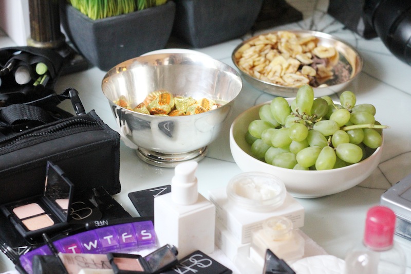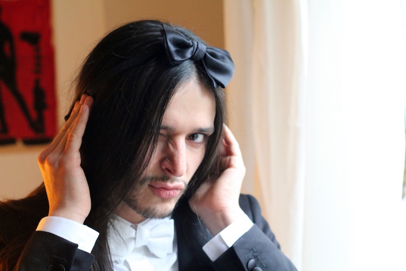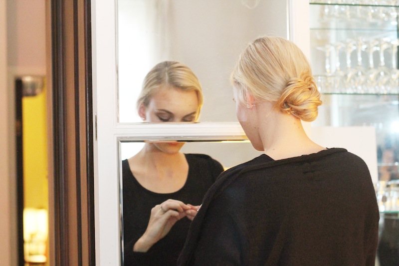 The duo agreed on softly shaded makeup and an easy (but “super chic”) up-do to compliment the “tee shirt-y” feel of her one-of-a-kind Theyskens’ Theory washed denim dress. Hairstylist Jordan M relied on a ¾ inch curling iron (“I’m in love with this size; you can do everything with it—from Brigitte Bardot to beach curls”) and Bumble Thickening Hairspray to give Trentini’s long blond hair some movement and hold, but left the final arrangement to the model herself. “Last year, a hairstylist put some product in, and said, ‘Just tie your hair.’ Sometimes it looks the best when you do it yourself—you know your own head shape.” Theyskens’ signature mane got a quick freshening up with Prep spray, a paddle brush, and a blast of hot air, the designer’s only request being, “Just give it some shine.”