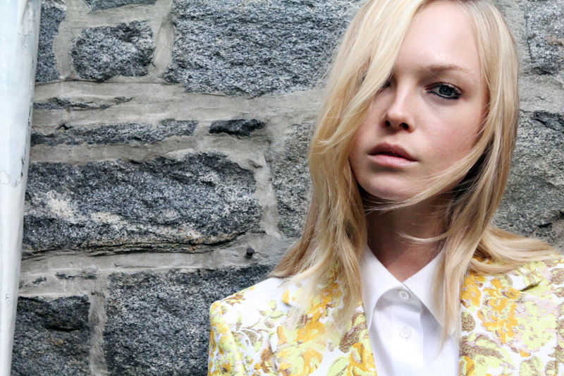 For her resort presentation, staged at a church in the East Village, McCartney was in a playful mood again. To complement the “really rich jacquards, poppy colors, and little elements of fluoro,” in the texture-heavy, interiors-inspired collection, the designer suggested that makeup artist Jeanine Lobell work in a little black eye pencil, but in an unexpected way. “We’re doing a straight-ish line under the eye—into a point, but not extended,” Lobell explained. “It’s short; it’s a little tougher. And, it makes the eye wider…if you do the line straight and don’t follow the roundness of your eye, it opens the eye up.” With Sunday Riley’s Pitch Black Velvet Gel eyeliner in one hand and a pointy cotton swab in the other (“They’re your friend, because you can kind of erase the liner into a shape you like,”), Lobell smudged Norwegian model Siri Tollerød’s liner into submission while the two chatted away in Swedish. Hopping up from the makeup chair after a quick coat of Riley’s Obsidian mascara—top lashes only—Tollerød slipped into her outfit to join the other girls for first looks, but popped outside with me for a few shots first. And her lemon blazer, spiked with lurex and perfectly fitted, was a true standout in the collection. “I love a jacket,” McCartney told me. “I trained at Savile Row in London, with a very historical way of looking at men’s tailoring, but as much as I love the way a men’s jacket looks, and the attitude it brings, for me it’s deeply rooted in psychology—that, in every woman, there is an element of male, and I think that’s really sexy.” Tollerød, buttoned up in the overcast courtyard, evoked a modern Mick Jagger, and embodied, as Lobell said, “that cool girl who has that one thing that she does with her makeup…that one little element that makes a face more individualized.”