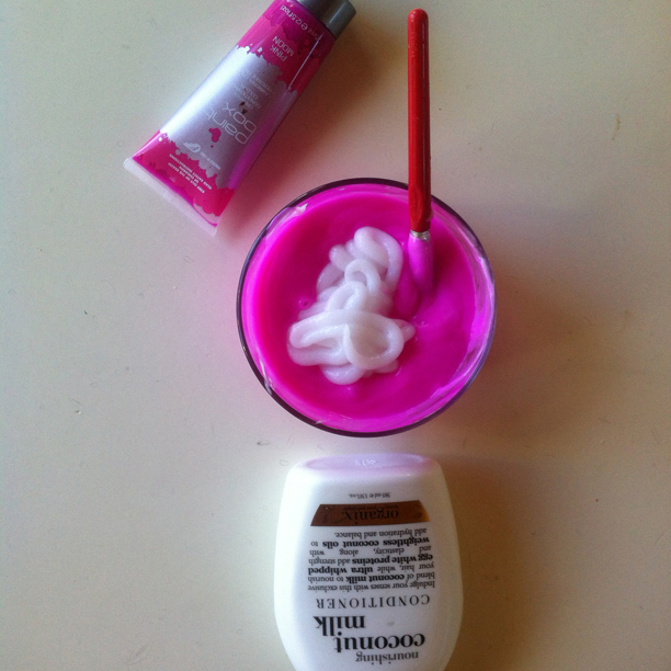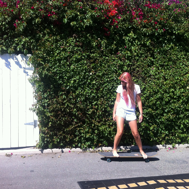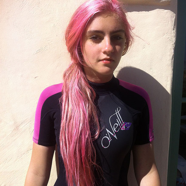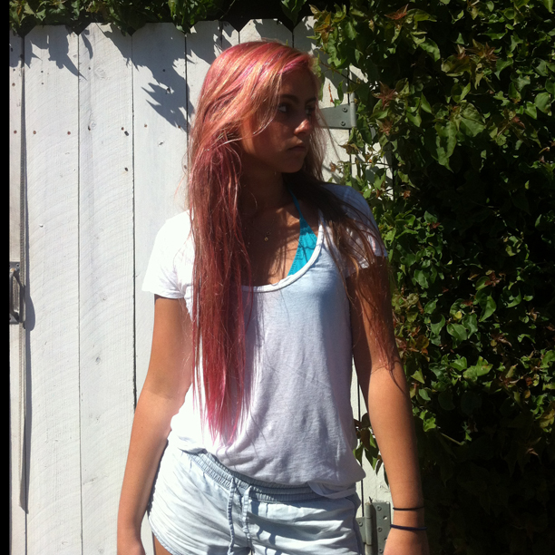 'Every summer we pack up and hit the road. We always end up spending three weeks on Capistrano Beach in Orange County, California, where surfing, skateboarding, and bikes are part of the daily routine. Also, a Lobell-Edwards annual tradition is mad hair experiments. Although I am a makeup artist, I must admit I am a bit of a closet hairdresser. Many of our friends and their children can confirm this. Somehow the fact that I can do makeup makes it easy for me to convince someone that I am capable of cutting a bob or bleaching their hair! Go figure! One summer, I even gave the two Capo Beach neighbor-boys matching mohawks—their mothers were less than thrilled, but they looked very cool. So today, Esme and I decided to bust out the pink dye. We wanted to aim for a baby pink, which fades superfast, but she'd been pretty clear: 'I don't want to look like an Emo girl.' With the help of Fudge Pink Moon, which Peter Gray (a licensed hairdresser!) claims is the best, diluted with some Organix conditioner, I went for it. My limited tools were: tupperware, a water-coloring paint brush and plastic bags. The paintbrush became way too annoying, so I just dove in with my hands. I do not recommend this technique as I am now very pink. I finished by wrapping her head in saran wrap and baking it in the sun for 45 minutes... The results were exactly what we hoped for and no, Esme, you don't look like an 'Emo Girl.''