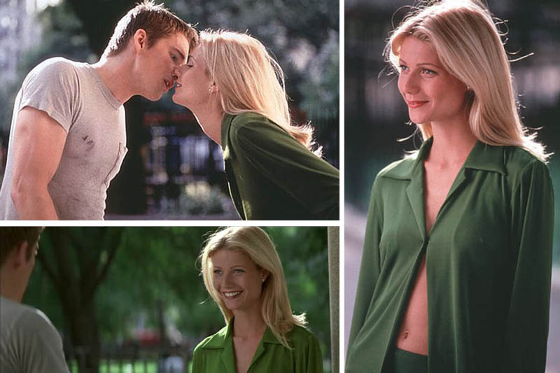 In the film, Paltrow plays the swanlike Estella, the unattainable object of affection for fisherman/artist Finn (Ethan Hawke at his scruffy best). Estella is a man-eating machine in mules (yes, mules, it was 1998) and Gwyneth truly sells it, gliding through the film all shiny golden hair, killer collarbones, and close-to-perfect bone structure. When she reappears in Finn’s life (after a ten year absence) in New York’s Central Park—clad in a kelly-green blouse and skirt by Donna Karan, the designer behind Paltrow’s parade of sleek, pitch-perfect ensembles—you immediately understand why poor Finn will never get over her: she is American beauty personified, and she doesn’t even seem to be trying.