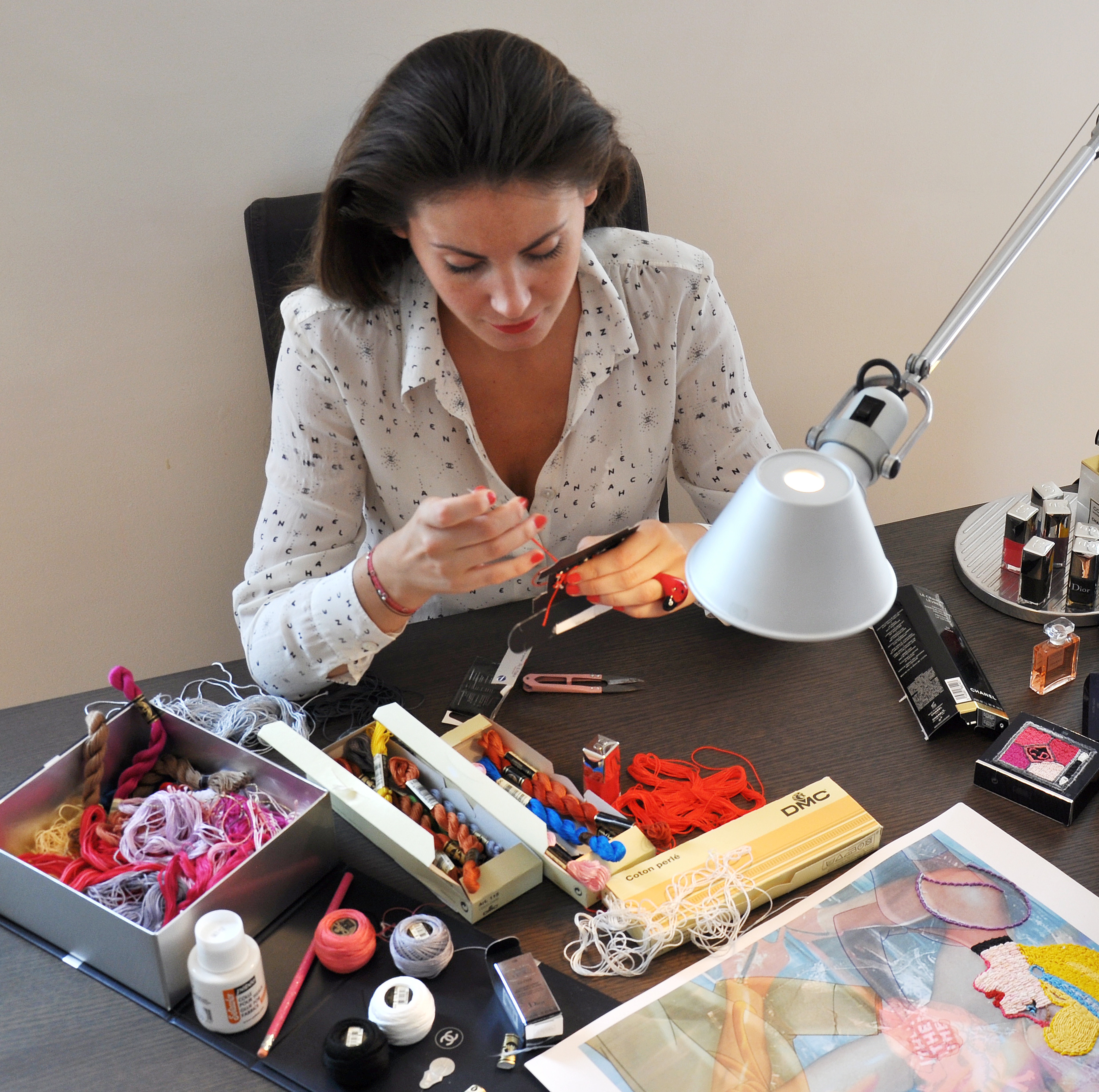 'I am a young 'artist' with an atypical career. I was going to be a lawyer when I suddenly stopped my studies, as I found out my real passion was and will always be ART. I love to transform objects to give them another life, identity, history, function. Moreover, relief and superposition characterize my work. Since my childhood I've always admired women's artcraft and handiwork, and for this project, I wanted to pay tribute to them. This is the reason I've started with embroidery: it represents different major subjects, like beauty and the meticulous work of handicraft, a properly very feminine work, concentration, meditation.