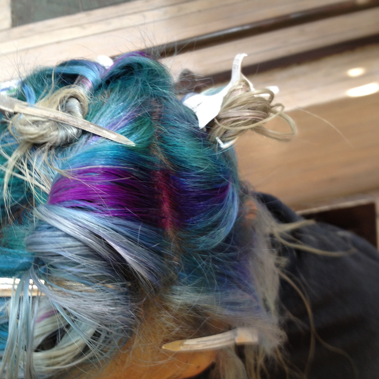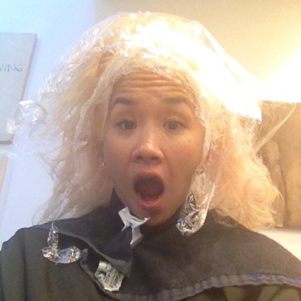 'Two weeks ago, I was super into the new Frank Ocean album that just came out. So I thought, 'Oooh, ocean is such a good theme for my Friday hair story!' I went to the only colorist I have ever trusted with my life, Naomi Knights at Ion Studio, and she made it happen!! I've been spending my summer in Montauk—when I have time between opening our new [Opening Ceremony] store in London—and was surfing in the pouring, torrential rain on Sunday. It was surreal, unreal, really real. But then, the 'ocean' in my hair was gone. Sad. Sea water is not a friend to hair, it turns out, and made the blue turn greyish-green. Blech. So, back to Naomi I went the following Friday, and I told her I needed something that wouldn't fade so fast and was 'cosmic.' She said, 'Cosmic galaxy.' Duh.”