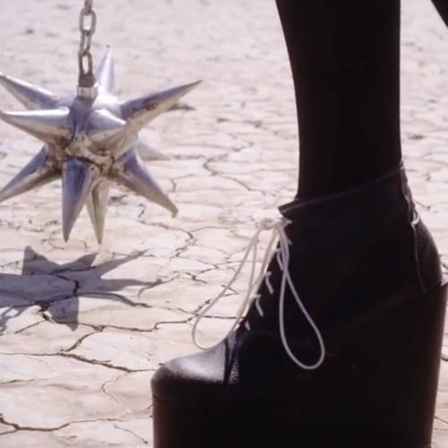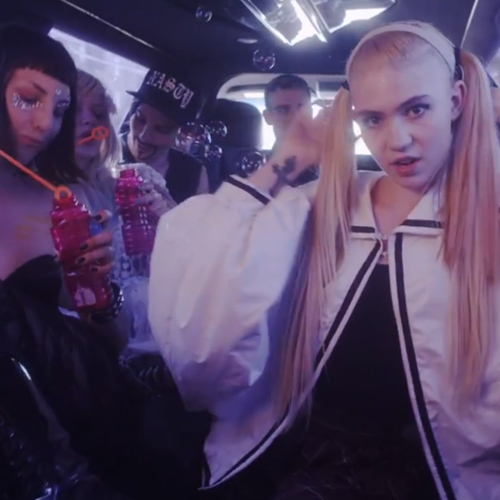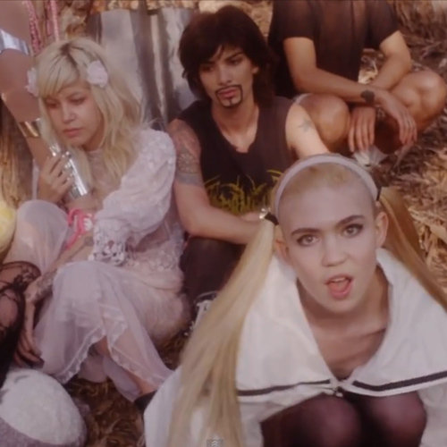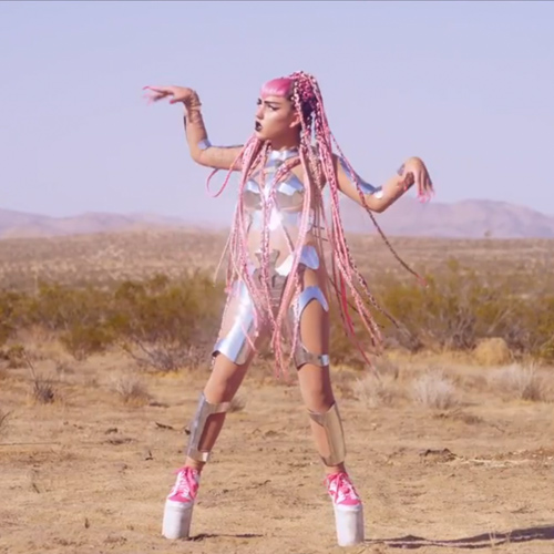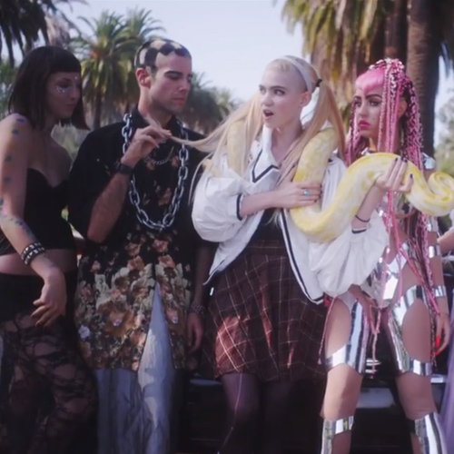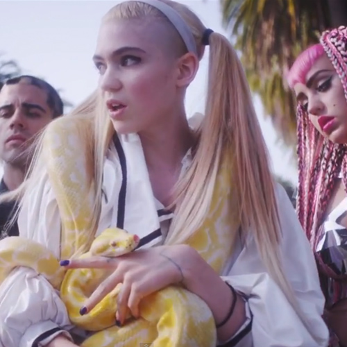 Following the success of “Oblivion,” which had her rocking out in a sports stadium, Canadian pixie Grimes is back with a new video for the equally catchy “Genesis,” and it’s straight out of Luc Besson’s The Fifth Element, with hints of Japanese samurai and anime. In the spot, directed by the singer (birth name: Claire Boucher) and co-starring rapper and stripper Brooke Candy (in cutout armor and bubblegum-pink waist-length cornrows), Grimes cavorts around the desert with a mace, a sparking torch, and a boa constrictor. Sure, the snake is straight out of Britney's 1999 VMAs performance, but “Slave 4 U” this is not.