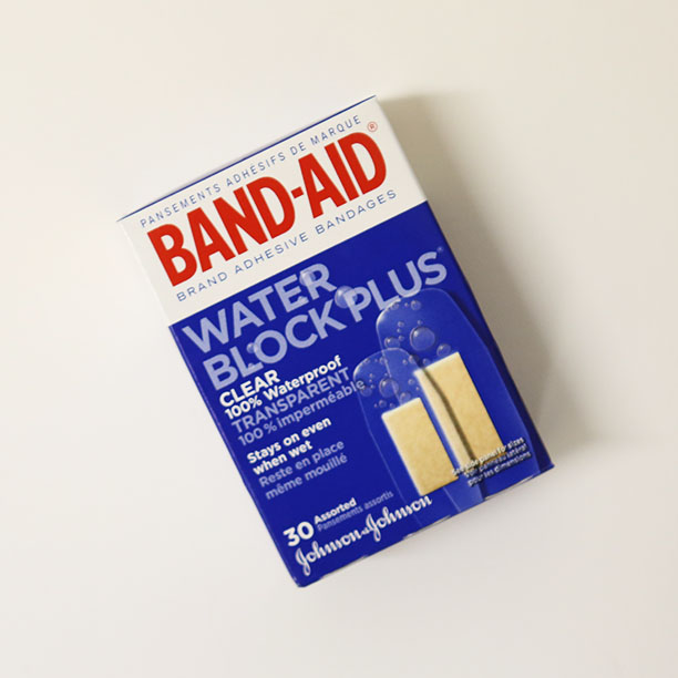 Band-Aid Water Block Plus Clear: The top of this box assures me, “You’re going to be just fine! (TM)“ which is not something I thought you could trademark, but is nice to hear anyways, even if it’s on the top of a bandage box in the)“First Aid' aisle at Duane Reade. I like these because they’re clear and feel like they have slightly more 'grip' than the classic beige. But they're still too flimsy for the job.