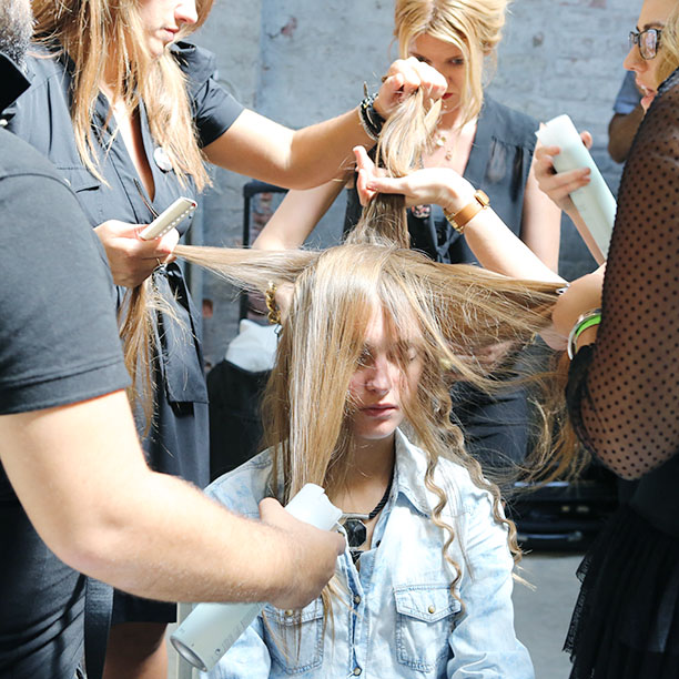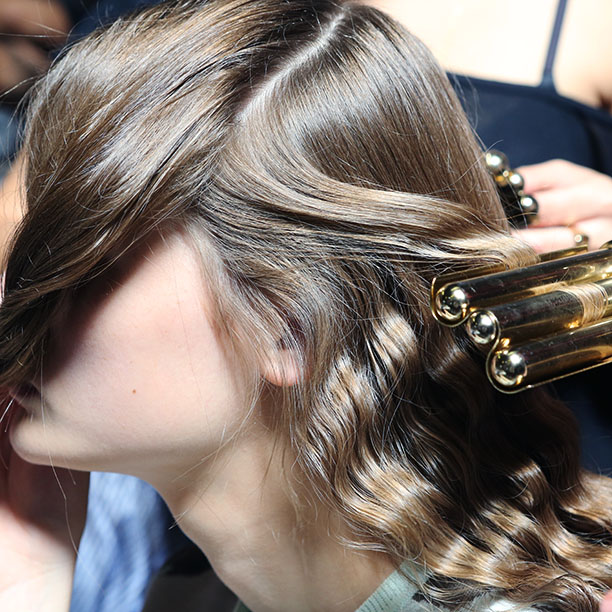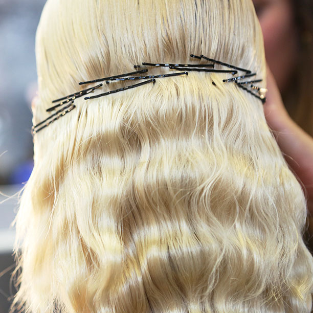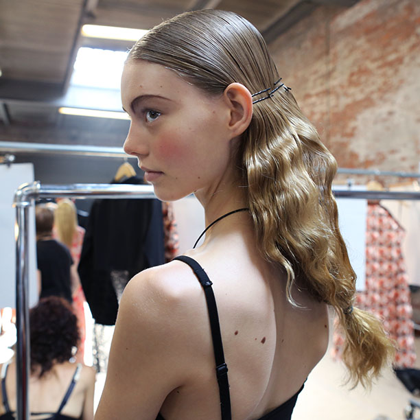 “It’s architectural and romantic,” Odile Gilbert said of the hair she had done for Thakoon's avian-inspired spring 2013 collection. The models' hair had been slicked back, laying nearly flat on the scalp, then curled with a three-pronged iron into finger-waves cascading from the back of the crown, and secured at the ends in a loose ponytail. The effect was that of a very elegant mullet, where the length of the hair all moved as one, like a row of feathers or a wing. “Thakoon’s inspiration was this idea of a garden—birds in a cage and butterflies and flowers—so we decided to go for quite a strict look, really slick, super shiny, and with all these black bobby pins as the ‘cage,’ with the length of the hair softly curled, and falling loosely out of it. We wanted something romantic but modern, but that didn’t look too modern,” she added.