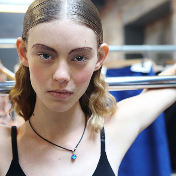 We spotted Ondria Hardin, nearly finished with hair and makeup and looking quite gamine, hanging by the racks. The dark eyebrows that makeup artist Diane Kendal had drawn made her appear exceedingly 1920s, or perhaps more Mia Farrow in 1974's The Great Gatsby. (“There were Twenties-era images on Thakoon’s mood board,” Kendal confirmed.) As Ondria perched and we snapped away, we took note of Thakoon’s opening look, on a hanger nearby. It was a strapless dress with a neckline that arched up towards the clavicle, printed to look like a tall, gilded cage full of butterflies and birds.