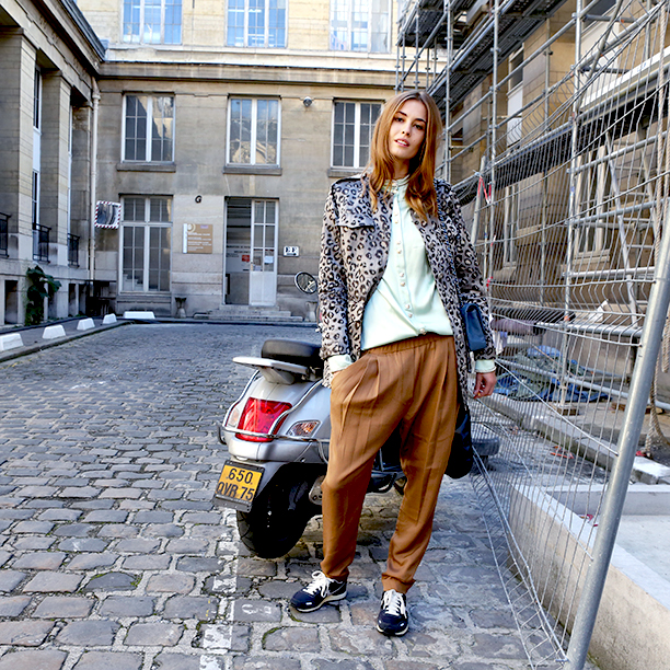 I always liked clothing but before I started modeling it was more black, black, black. I was always like, “It’s so expensive, if you buy it in black, you’re going to wear it forever.” Whereas now, I’m more into color and stuff like that. It’s more fun. I love leopard, I really do. So, everything in leopard I think! The jacket I’m wearing now is a Danish designer called Heartmade. The shirt was a present from Balmain, and the pants are by Phillip Lim— from that Barneys Warehouse Sale! They’re so comfortable. I’m wearing sneakers, but that’s only because when I packed, I packed mostly sandals, so this is the only pair of actual shoes I have. I never wear tight clothes, I don’t like to feel uncomfortable.