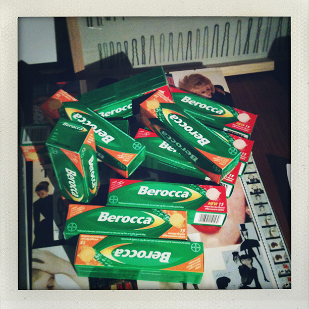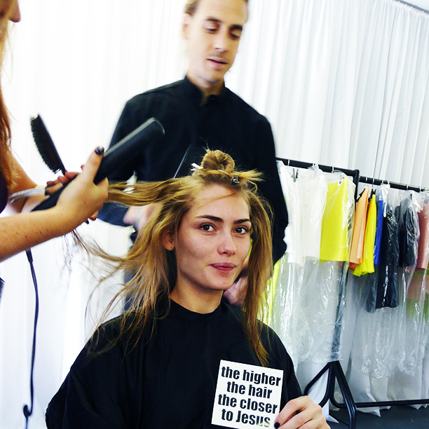 James Pecis, the up-and-coming Cali-born, London-based, heavily inked hairstylist, has been hitting the show circuit—hard. He checked in with us along the way, and what's more curious than the fact that he's racked up an impressive $4,000 tab in excess baggage (think wigs, extensions, and blow-driers rather than clothes) is that his team swore by an amazing un-drug to get them through the recent Milan collections. Berocca, an orange-flavored Emergen-C-like effervescent vitamin/mineral supplement that does wonders for curing a hangover (or, pro tip, preventing them when consumed pre-bed after a crazy night), sponsored several of Pecis' shows, and, as he tells us, “kept the team healthy and peeing neon all week long.” Fluoro urine aside (hey, it's better than asparagus pee), Pecis also made his mark by “leaving my 'Higher the Hair, the Closer to Jesus' stickers along our trail...”