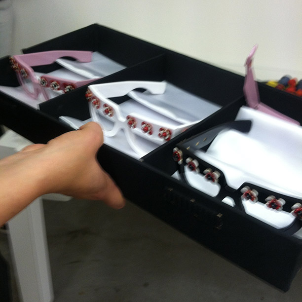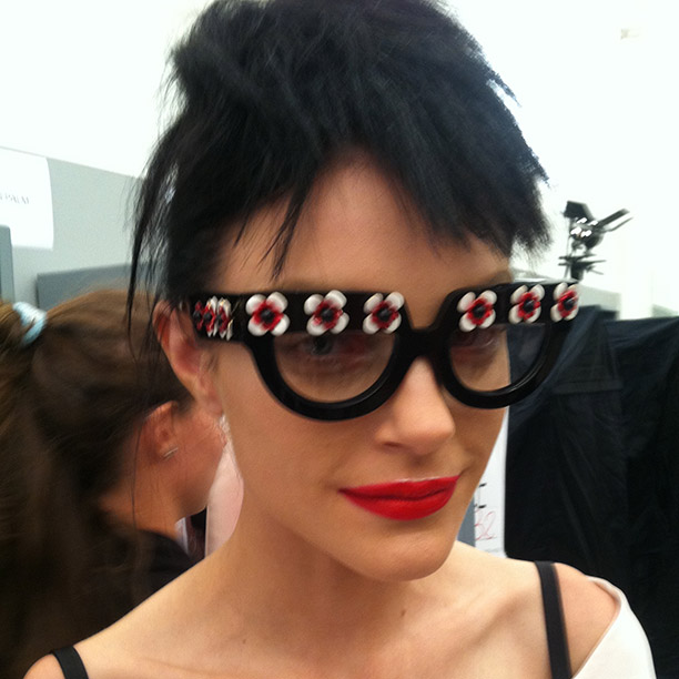 At noon today, Prada very kindly live-streamed their spring 2013 show for all the non-industry, fashion-obsessed world to see. At ITG, we had our eyes glued to our screens for those twelve minutes, because, really, isn't it one of the most “important' collections, in terms of trends/influence? (Top 5: Marc, Prada, Balenciaga, Celine, Givenchy... do you agree? We had a debate.) “Ah, '60s! Marc called it,” someone clapped as the whole thing kicked off: no pants, clean lines, and nearly identical (except for color) rough-and-tumble, Edie-esque short wigs. There were flatforms with socks, lots of black satin, a vaguely Asian, digitalized floral print, a whole bunch of new faces, and one Miss Jessica Stam sporting next season's inevitable 'It' glasses. “I'm obsessed with the eyewear,” she emailed from her Milan hotel room, post-show. And what of the hair and makeup? “The hair was tomboyish to offset the feminine clothing, as per Miuccia's request,” Stam, a Prada regular, explained, attaching her iPhone snaps, “and the makeup was an overdrawn, bold red lip with natural glowing skin,” If this is anything to go by—and let's take a moment to acknowledge the ripple effect of last season's dip-dye, sleekly straight hair—then we're placing bets on a 'classic red lip' and 'boyish cut' being beauty-message numero uno next spring...offset, of course, by some serious shades. [Update : Stam's bold red lip is CoverGirl Lip Perfection Lipstick in Hot.]