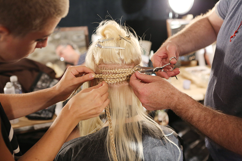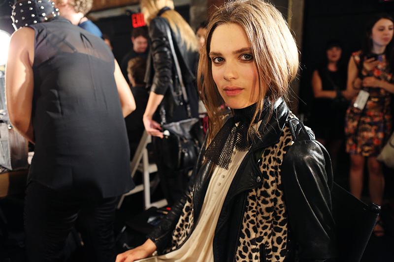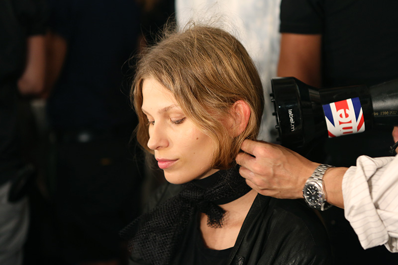 Paul Hanlon (Frederic Fekkai): It's the Proenza girl. The girl who every girl wants to be-- as opposed to the whole reality television star, 'voluminous' thing. If I had a daughter I wouldn't want her looking up to that. I would want her to be looking up to the Proenza girl. I've been working with Jack and Lazaro for five years, and each season it's the same girl, but with a different twist. We had over ten hours of hair tests for the look: it's very separated, dirty, day-old hair. Kurt Cobain hair. We made a mark in the head, almost like if a girl had wet hair and tied a scarf around it, and then took it out later, when her hair was dry... or in the morning when you go to work with wet hair and you put your jacket over it. It's subtle, but I think it's quite true to the Proenza Schouler woman, the feeling of life in the hair. The girls who have thicker hair have a braid across the undersides of their heads so everyone gets that really thin separated look. We used Perfectly Luscious Curls Wave Activating Spray after, so it's a little bit dreadlock-y, a little disjointed—maybe she slept somewhere and just got up. This girl doesn't carry a brush around with her, she's confident in the way that she looks, she doesn't really care about the rest. I like the tension this hair gives, worn with the clothes, which are so incredibly luxurious and expensive. She's that American girl you see on the street who has a little bit of danger to her—she's not just sweet.