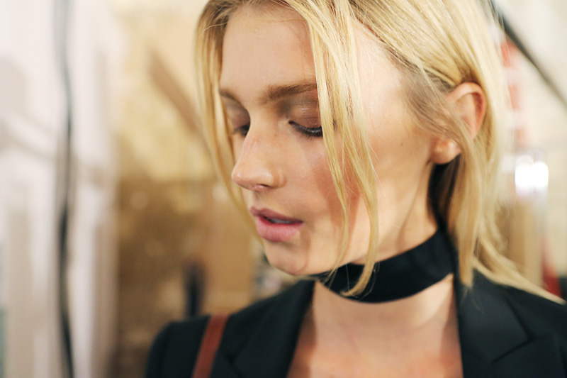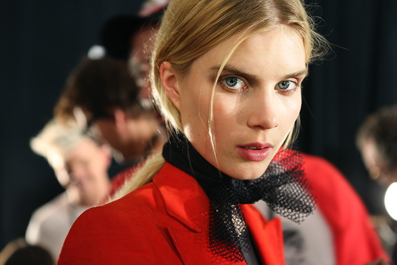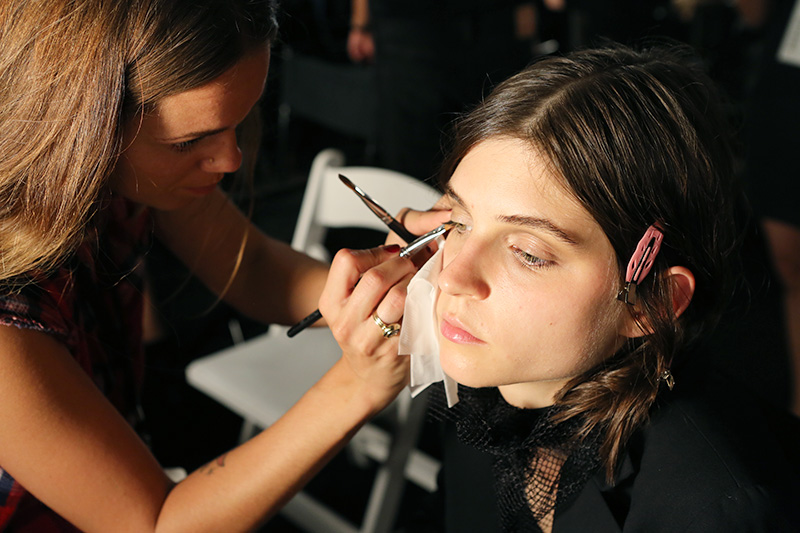 Diane Kendal (MAC): The makeup is really very light. I just used a light coverage foundation [Studio Finish concealer], then the Eye Pencil in Coffee, just in the crease of the eye and a little line underneath, blended with a brush. It's harder underneath and then very soft up above. I used the [yet-to-be-released] Mineralized Glamour Era Lipstick on the cheeks, because it's quite sheer and has just a hint of color and still has that sheen to it. The eyebrows, we put wax in them and then brushed them and feathered them up with the Powder Eyeshadow. The eyebrows were just my interpretation of what they wanted. They just wanted her to look 'cool.'