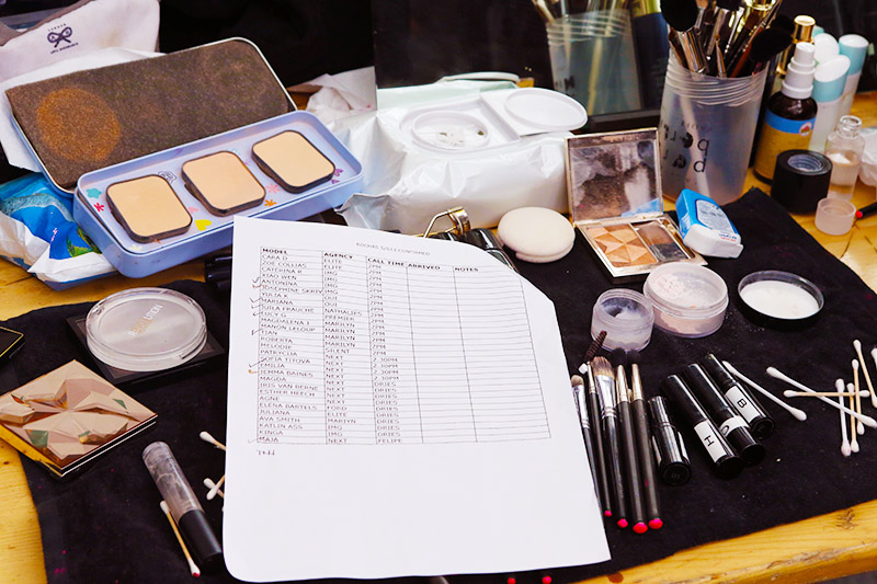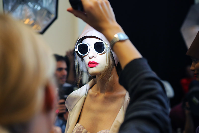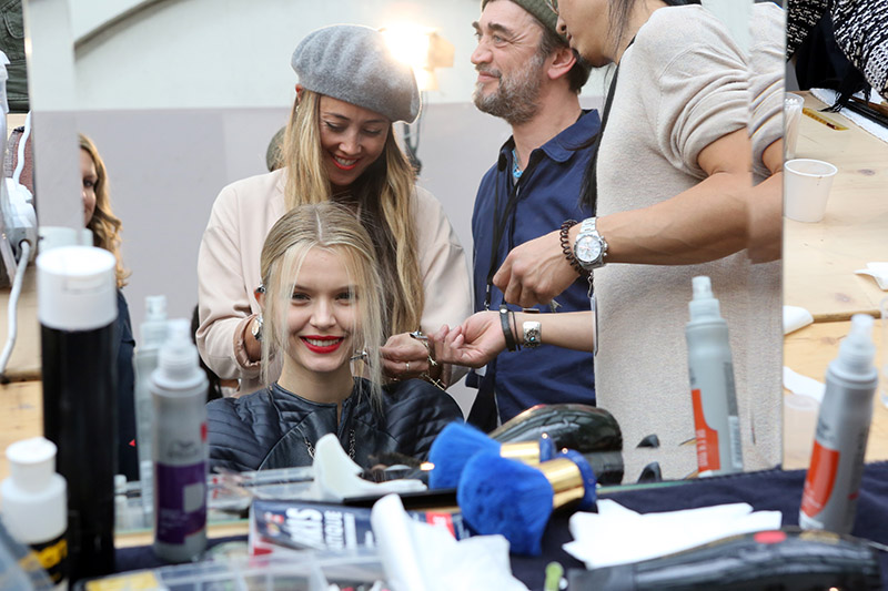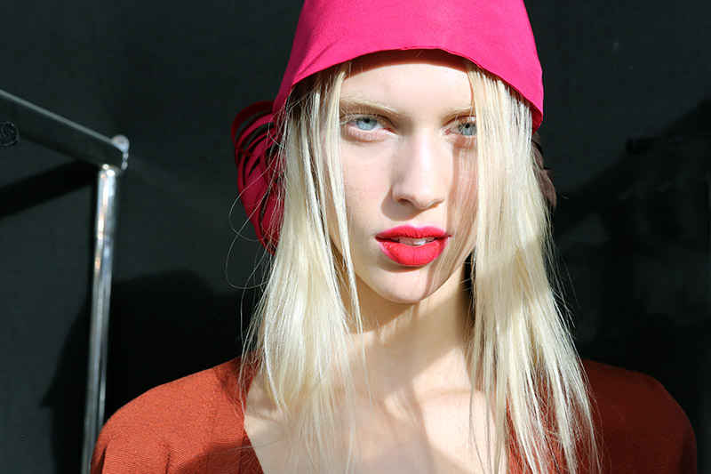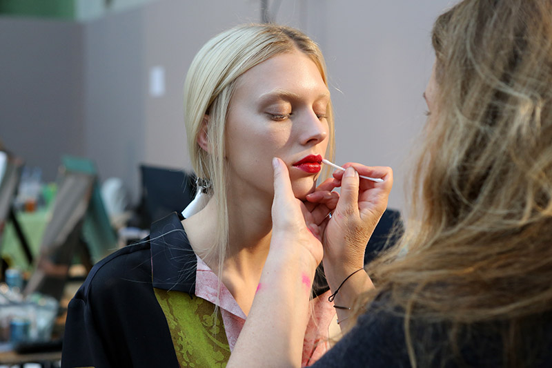 Lucia Pieroni (Clé de Peau): The look we’re doing today is gorgeous porcelain dolls with amazing, really matte, strong lipstick. In a strange, weird way, they’re kind of like California girls that never go in the sun. They’re very pale, very beautiful. The skin is super natural, with a little bit of highlight on the eyelid—using three gold colors from the new Spring quad—and then the new highlighting palette across the cheek. You don’t really see much of the eye with the amazing scarves in the show, so we just did highlights to make them sparkle a bit, so when you do see someone’s eye, it kind of pops out.