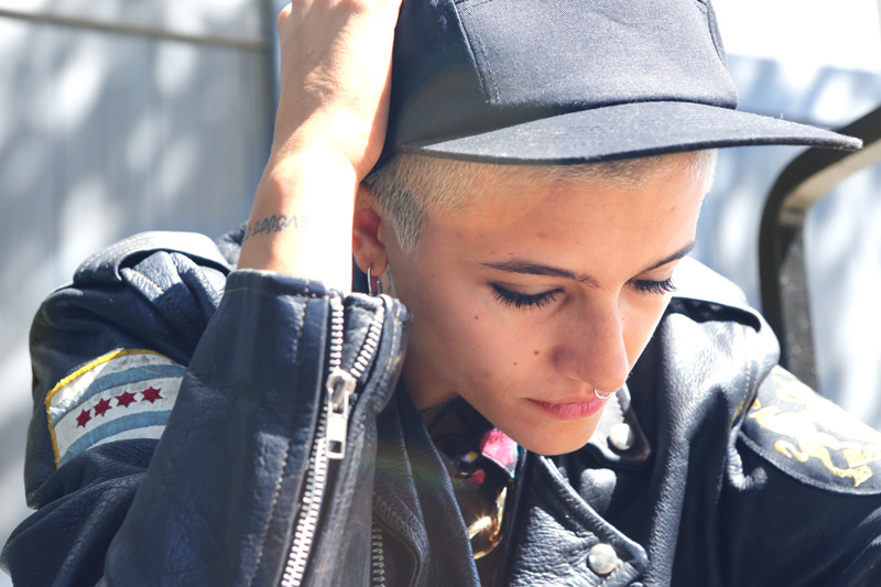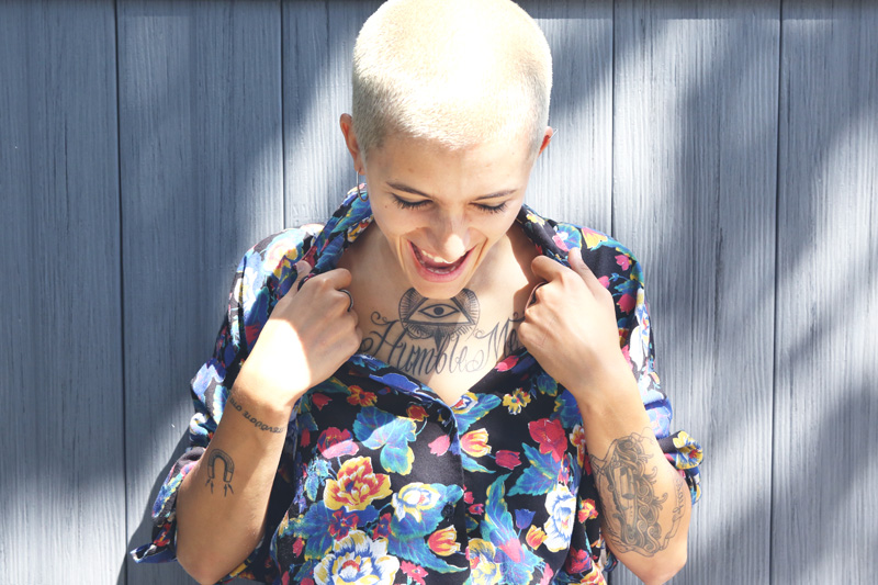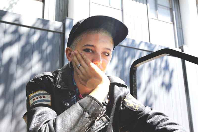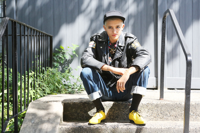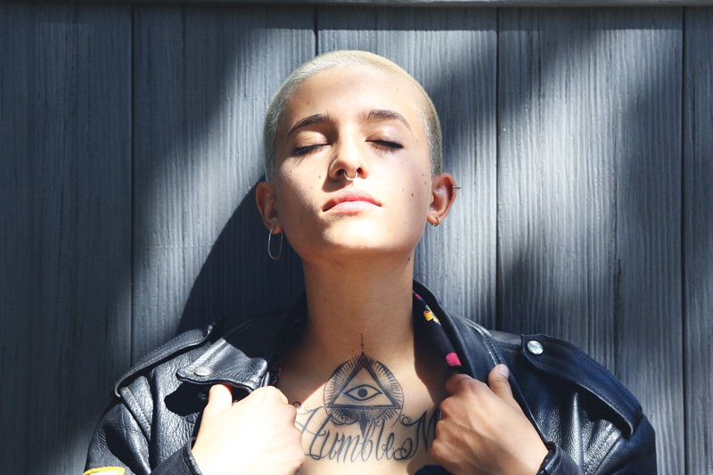 'I recently shaved my head. I just had an urge one day, so I went to Walgreens and bought some clippers and shaved it. [Laughs] It’s super liberating. Especially as a woman, you’re told you have to have long hair, you know? Or else something is taken away from you. But it’s like freeing your chains, to be able to do whatever you want to do. The color was natural brown for a little and then I just bleached it all out with Manic Panic. To get it super white, there's a special mousse called Redken 9V, which has a violet-tinted undertone to make it whiter. You put the mousse on after you bleach it; it’s a finisher. I do that about once a week, when I see the hair tinting yellow.