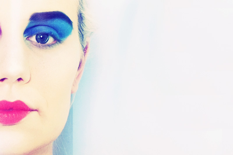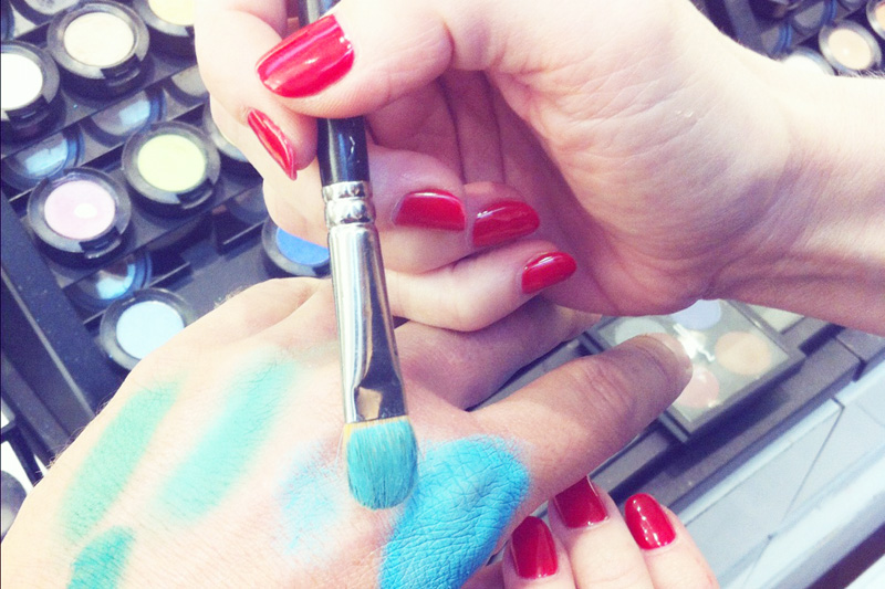 Because the painted face of streetwalkers and actresses at the end of the 19th Century was considered vulgar to the extreme, we decided to use bright blue and green cream shadows to create an “artificial” look—one that calls to mind the poisonous ingredients used in commercial cosmetics at the time. Gregory mixed together two parts of MAC Marine Ultra Chromaline with one part Pure White Chromaline and applied the formula from [the model] Ashley’s lash line to her brow in the same color consistency. He finished and softened the look by powdering over it in more Porcelain MAC powder.