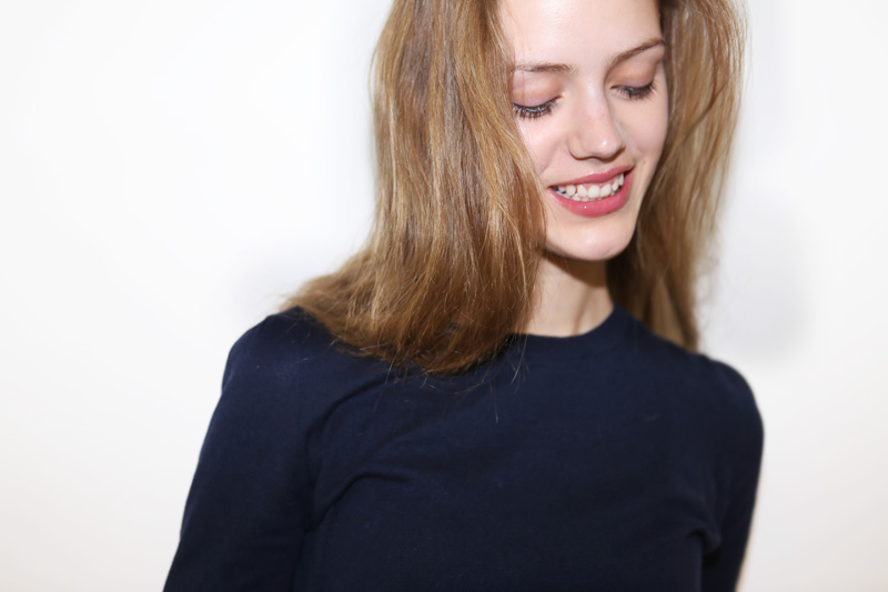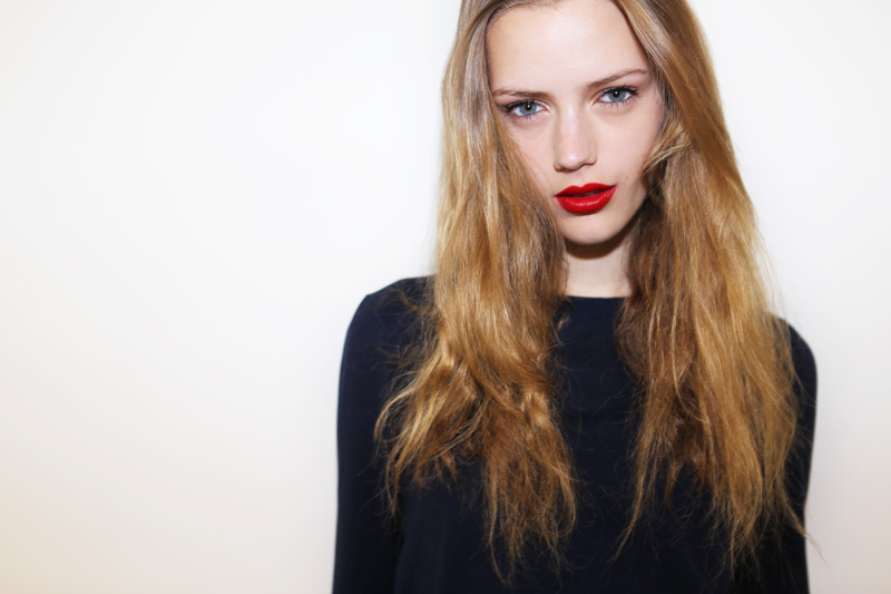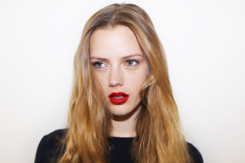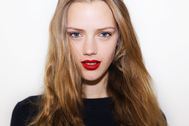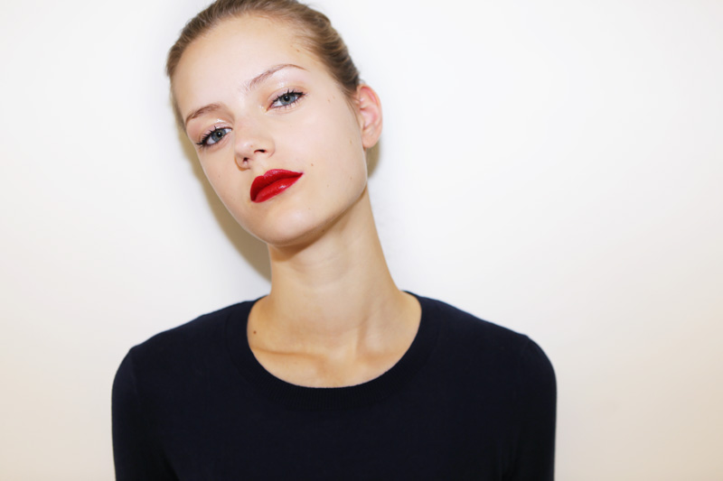What’s also cool is being 16 years old and insanely gorgeous without a lick of makeup, like Esther Heesch (NEXT). The wide-eyed, bushy-tailed German teen just finished her first round of runway shows (Balenciaga, Céline, Prada, Jil Sander, check, check, check) and landed in the Big Apple for a few days last week. So, here sitting in front of me is this baby, basically, with amazing skin, bright eyes, the whole lot, but that doesn’t mean she can’t look totally different with five minutes worth of strategic makeup. So I got all Bobbi Brown on her with a handful of items that, in my opinion, are ‘look changers': Clé de Peau Concealer (around the nostrils, under the eyes, and on little spots), Elizabeth Arden Eight Hour Cream (on eyelids and tapped onto cheekbones), black mascara (Lancôme Definicils) on top lashes only, black eye pencil (Estée Lauder) in a thin line on the bottom only, and a BRM—Bold Red Mouth—courtesy of Giorgio Armani’s new Lip Maestro liquid lipstick in the brand’s famous rouge, 400. At some point, I had asked Esther, “Do you wear makeup?” She said no. But before she left, I held up the shiny red tube of Lip Maestro and offered it to her. “Do you want it? You can take it.” A humongous smile spread across her face— Sure!!! Ah, makeup. Brown doesn’t call it “ pretty powerful” for nothing.