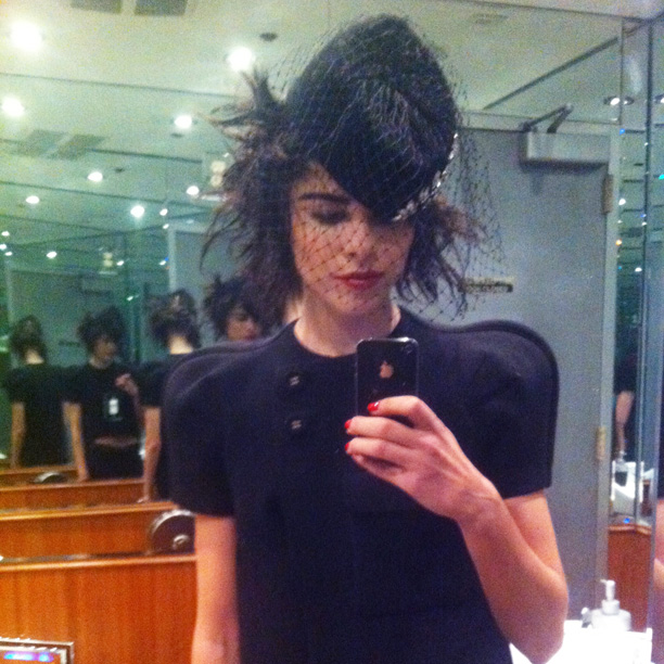 For the shoot, Kendal worked her well-documented face-sculpting magic, painted on some seriously boyish brows, lacquered up my lips, and sent me over to Palau, who sort of paused for a second and said, “Let's just do it on the set.” So as I sat on a stool in front of one of my favorite photographers in the world, Guido's assistants passed him bottles of products and no fewer than five instruments, like doctors in an E.R. “Scalpel.”) while he twisted and twirled pieces of my hair out from under a hat. Snap! Snap! Snap! and ten minutes later, I walked away. Did that even just happen? It did, I was reminded, by standing in front of a kiosk in the SoHo Sephora, snapping pics of myself (and texting Langley hers) to send to my parents, in what was probably my most meta moment to date. And now, I'll go back to being the beauty reporter. But it was pretty friggin' awesome, and I just had to share.